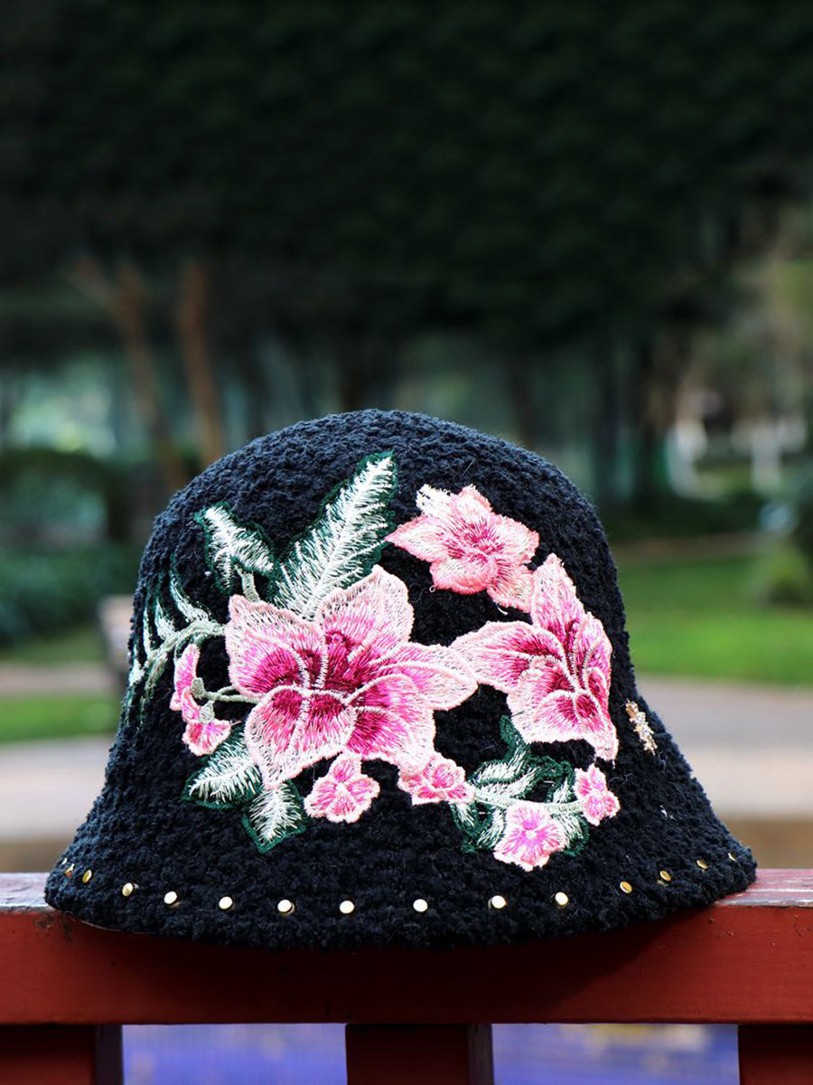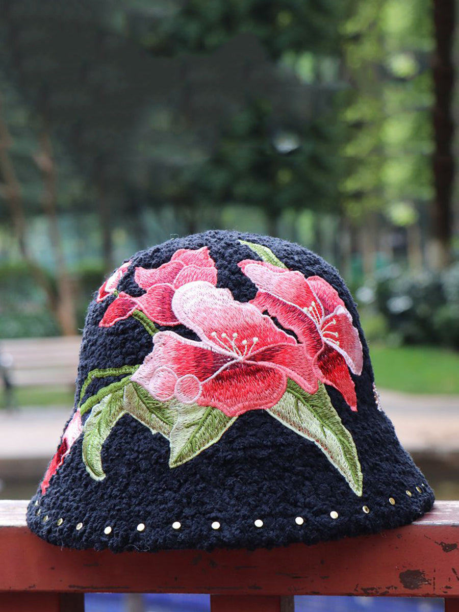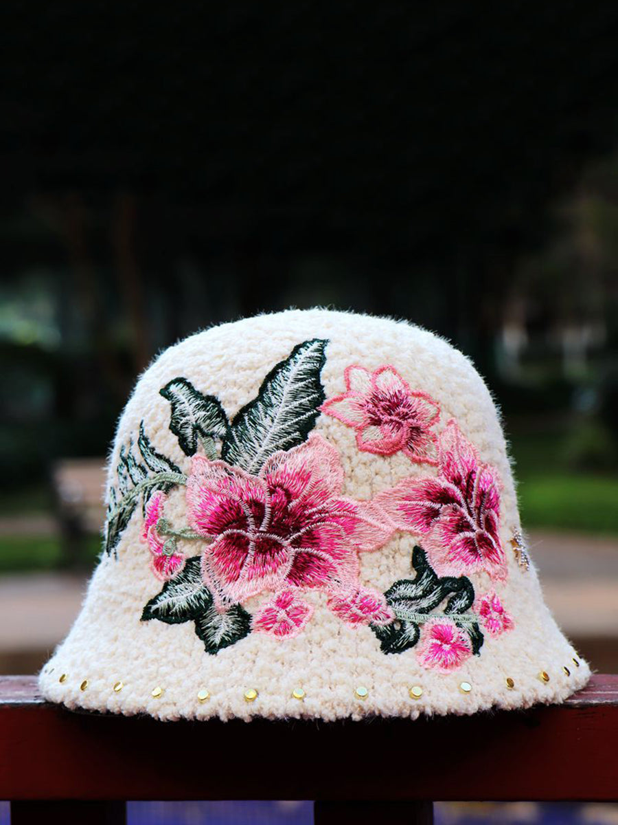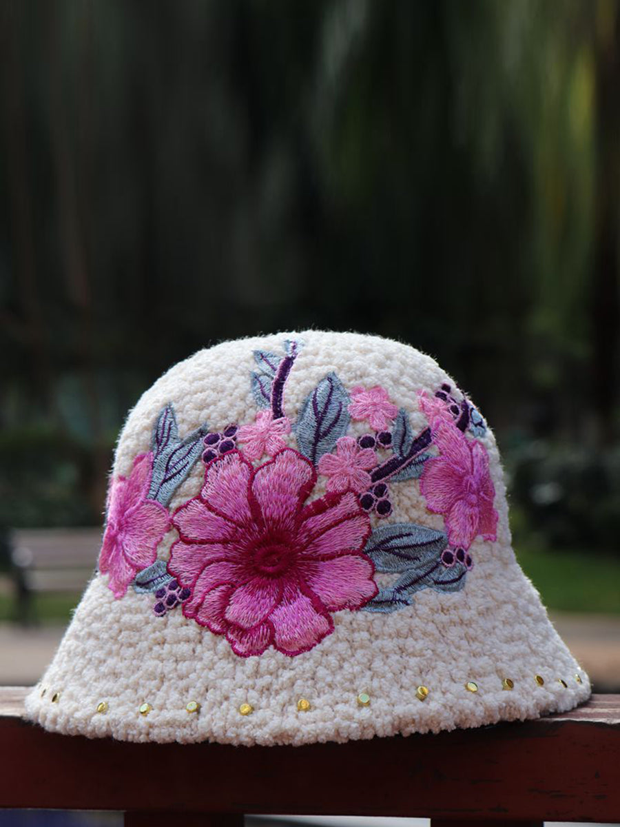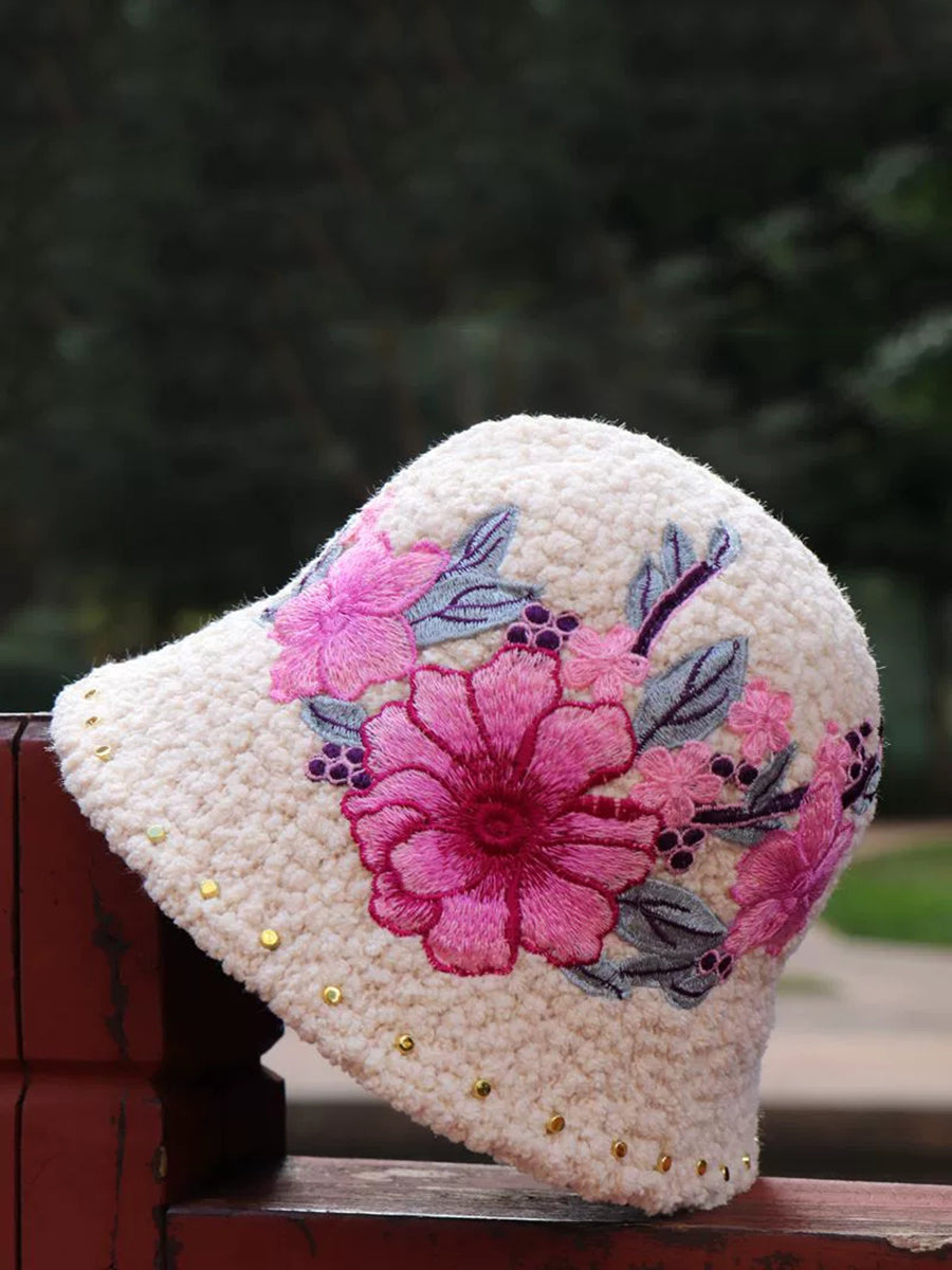 Women Artsy Winter Flower Embroidery Fleece Hat