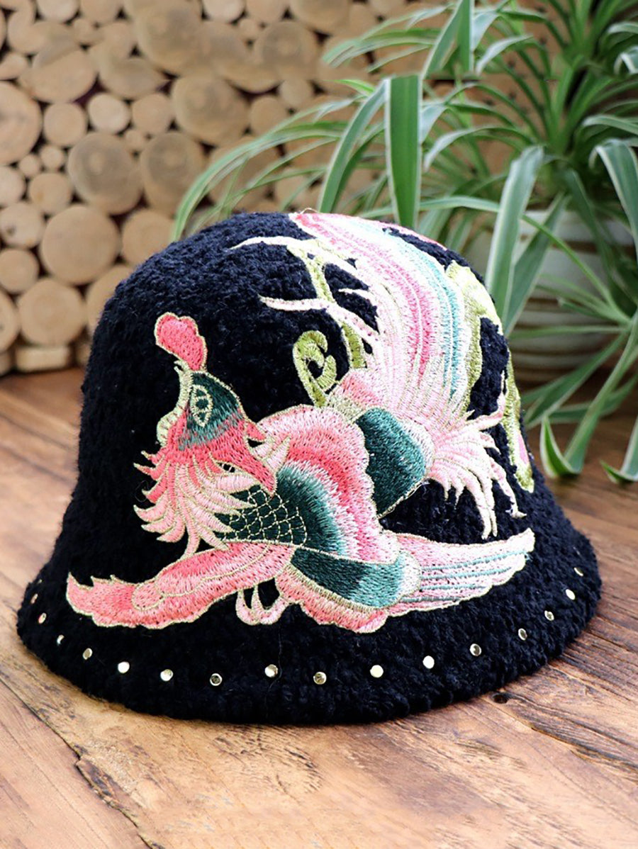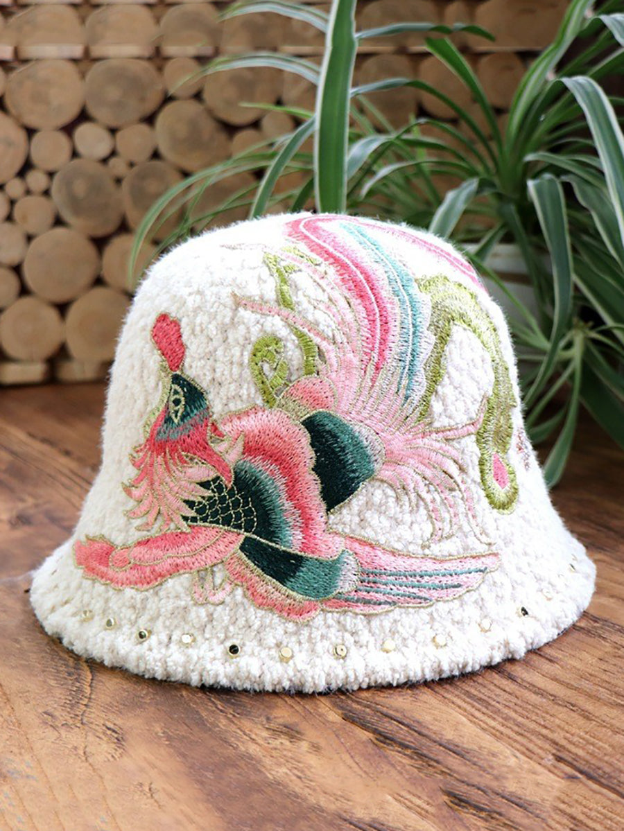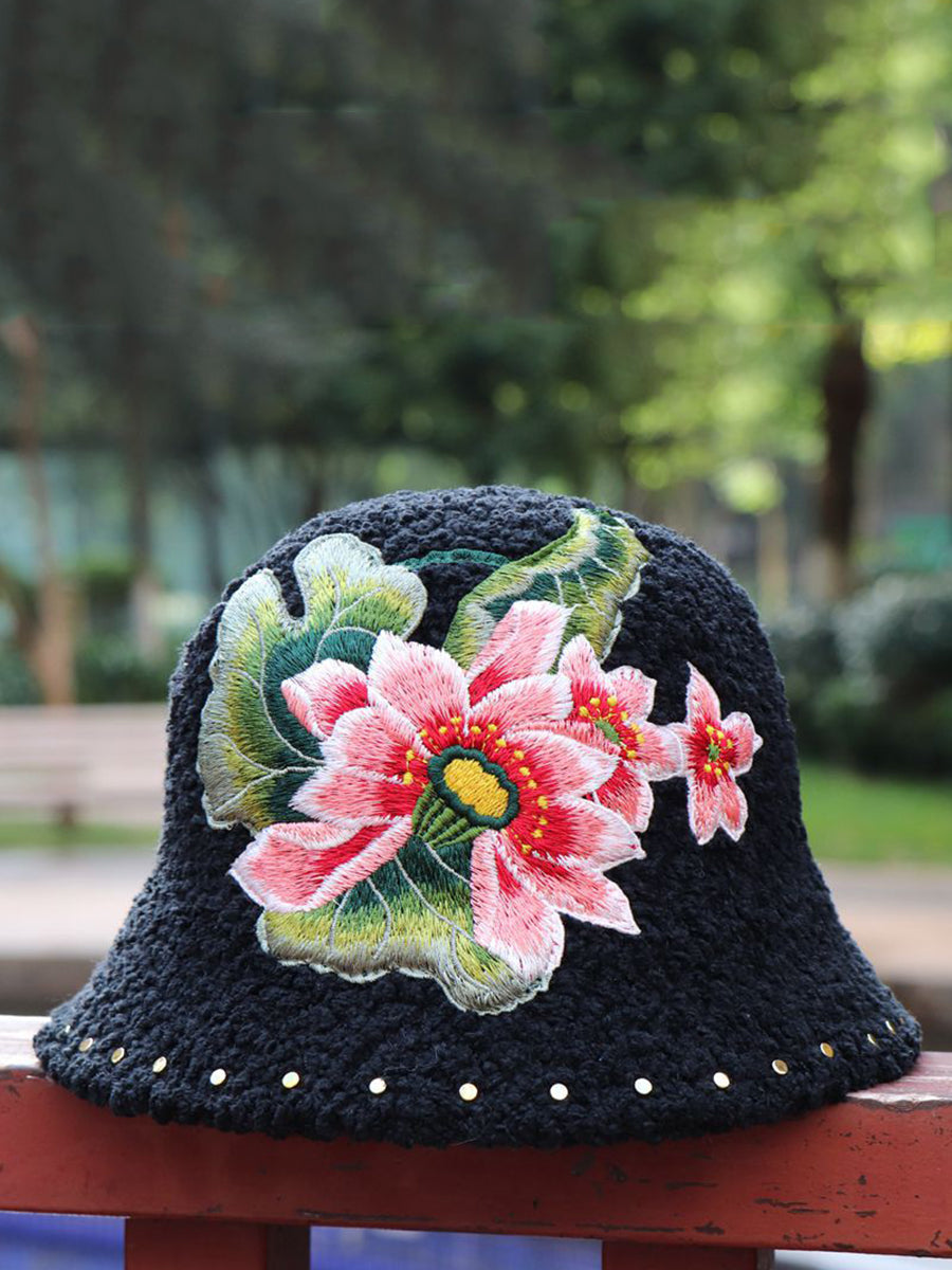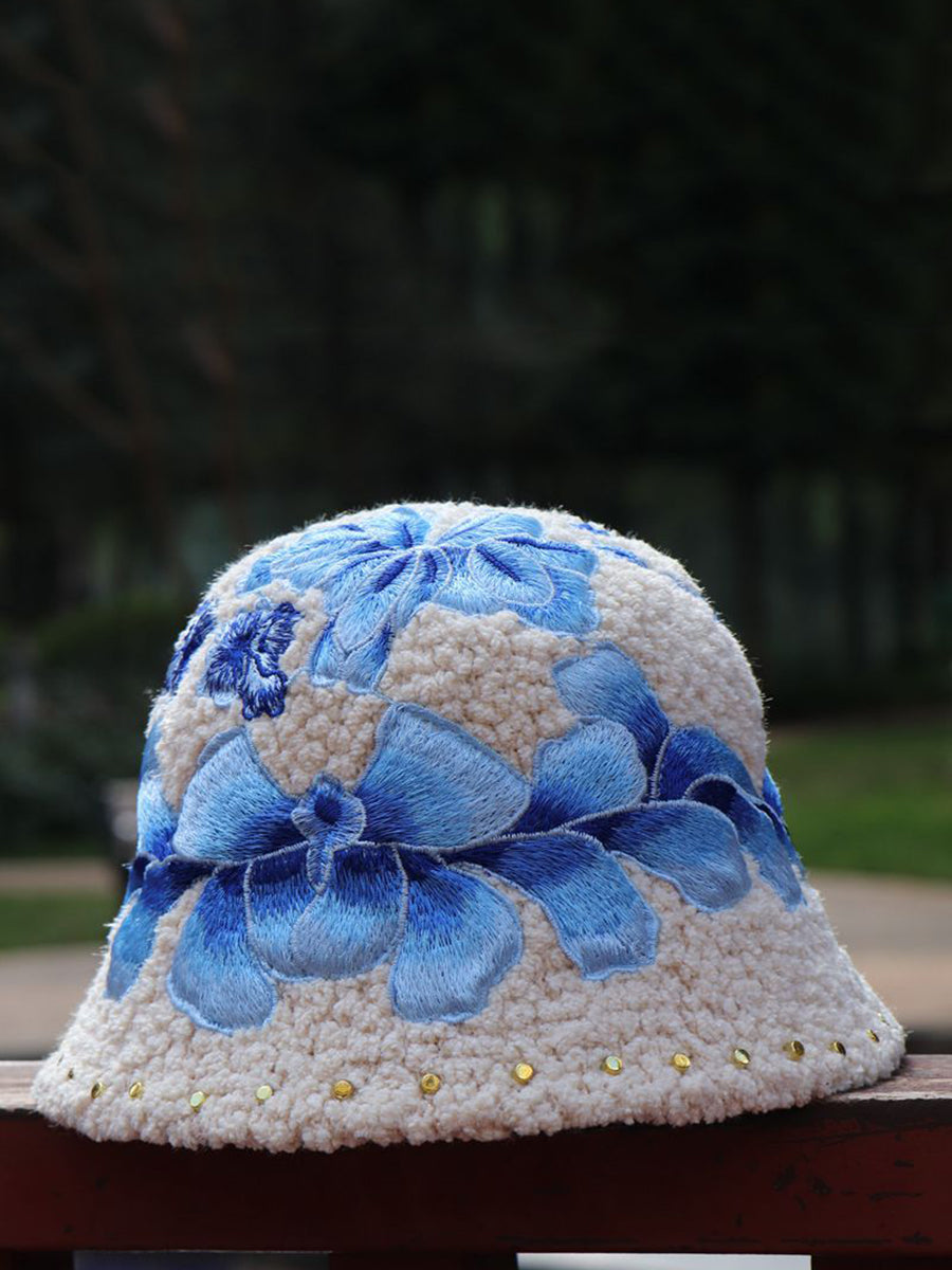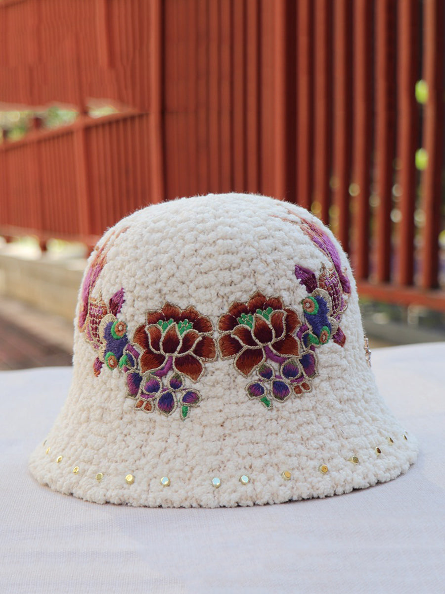 Women Artsy Winter Flower Embroidery Fleece Hat