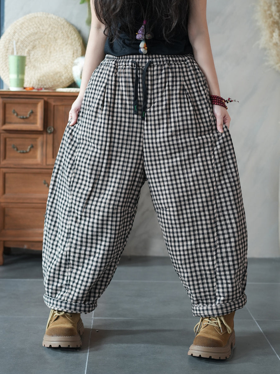 Women Winter Retro Plaid Padded Harem Pants