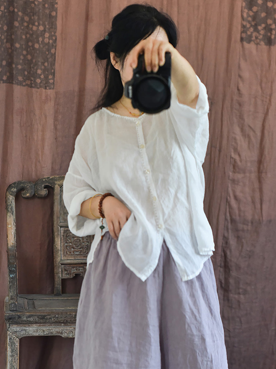 This Women Vintage Solid Summer Stitching Blouse features a solid pattern. It has an o-neck collar, full raglan sleeves, and a vintage style that is perfect for the spring and summer seasons.