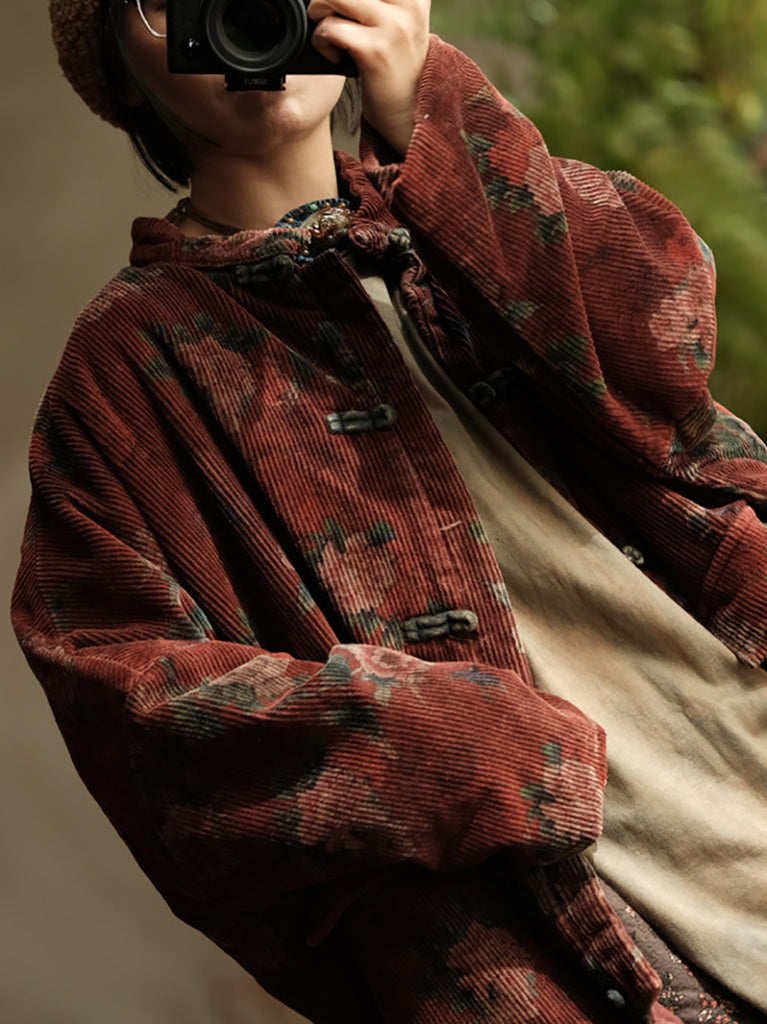 Women Ethnic Flower Corduroy Loose Padded Coat