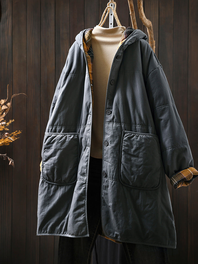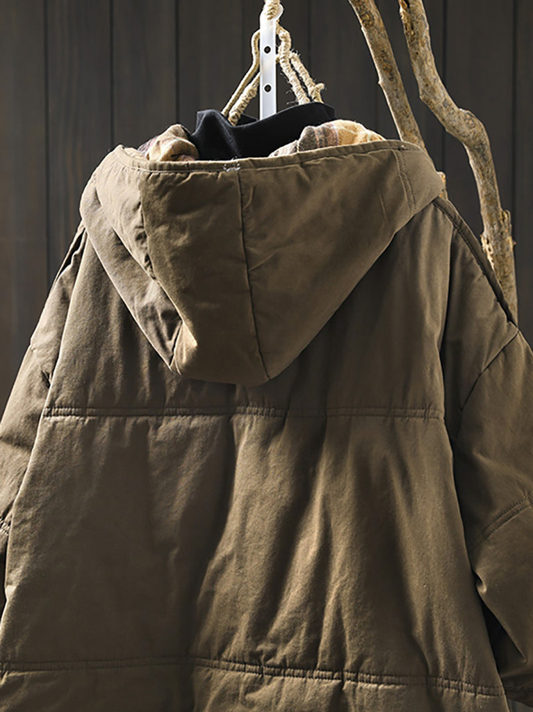 The product features a clean, solid color design, a hooded collar, and full raglan sleeves, combining classic and vintage styles, perfect for the winter and autumn seasons.