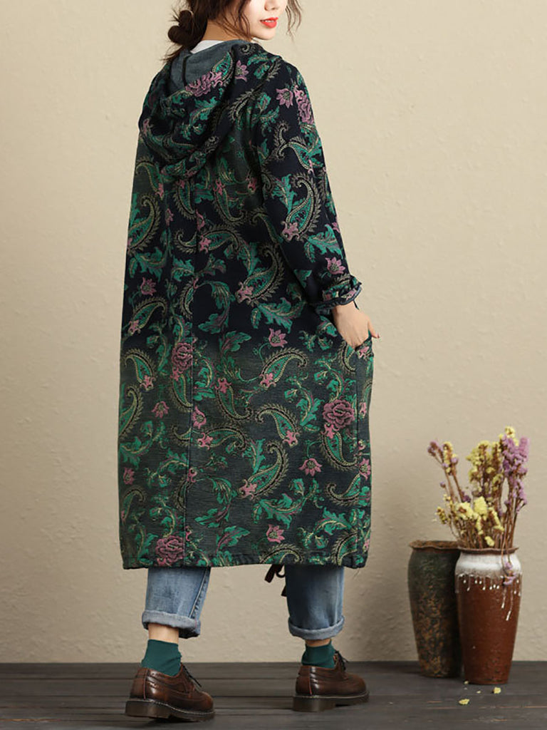 Women Autumn Vintage Flower Hooded Pocket Cotton Coat