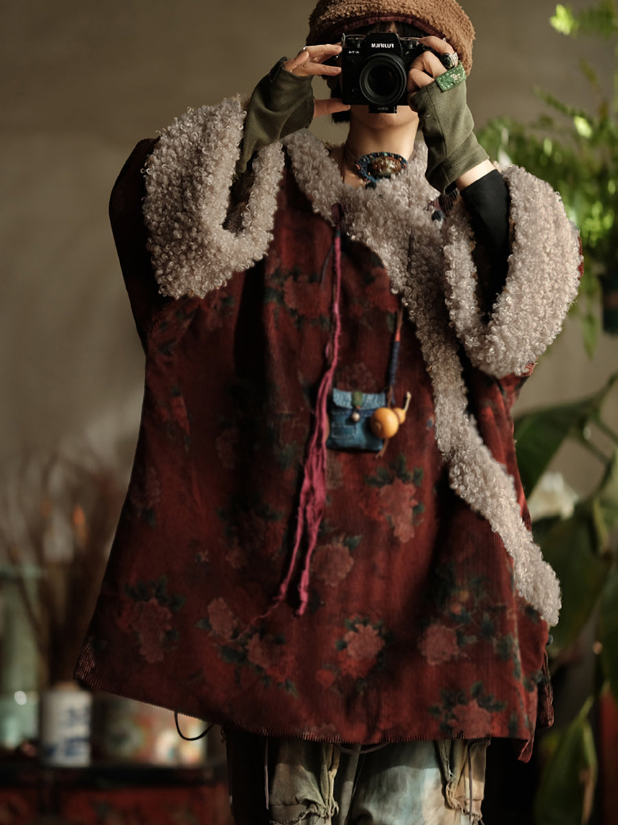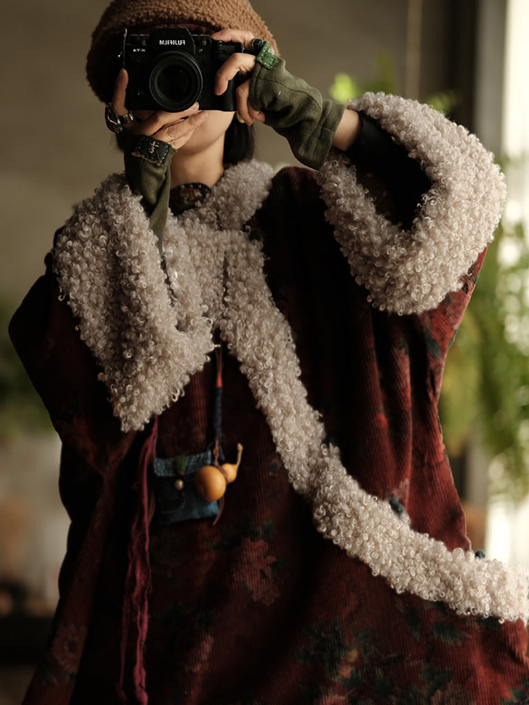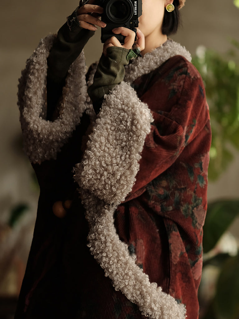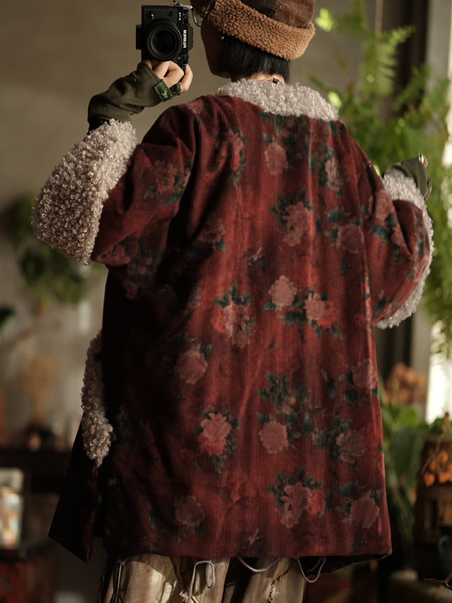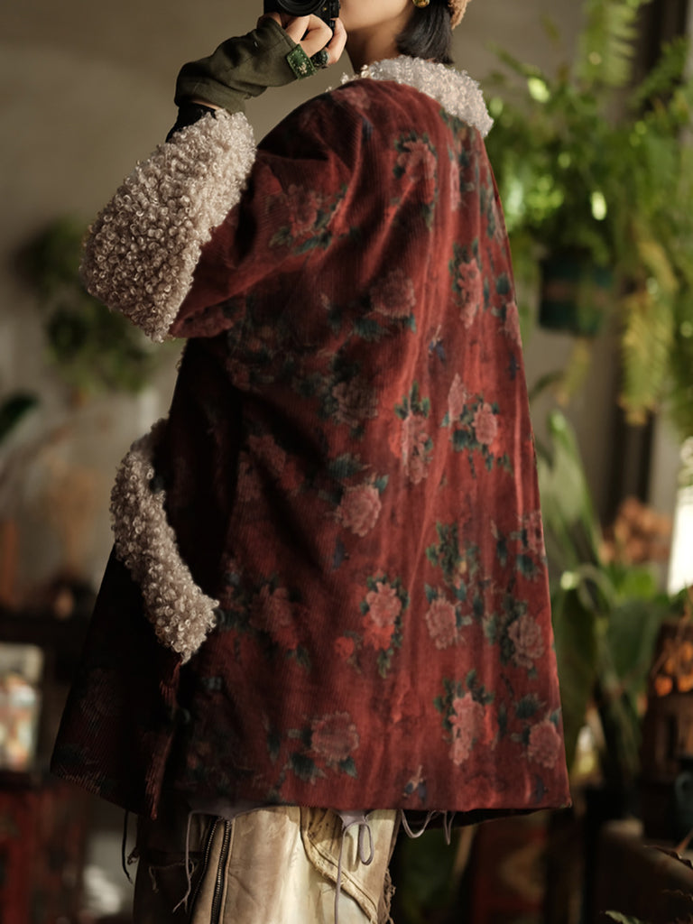 Plus Size Women Ethnic Flower Fleece Spliced Corduroy Padded Coat