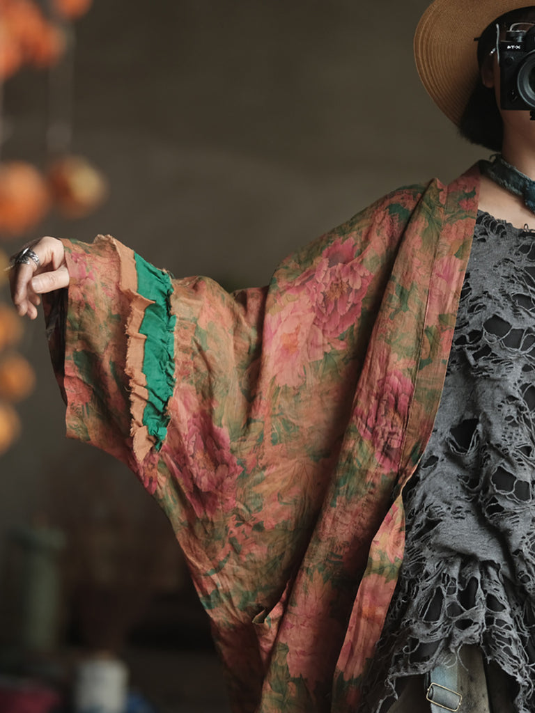 Women Summer Artsy Flower V-Neck Ramie Shirt Coat