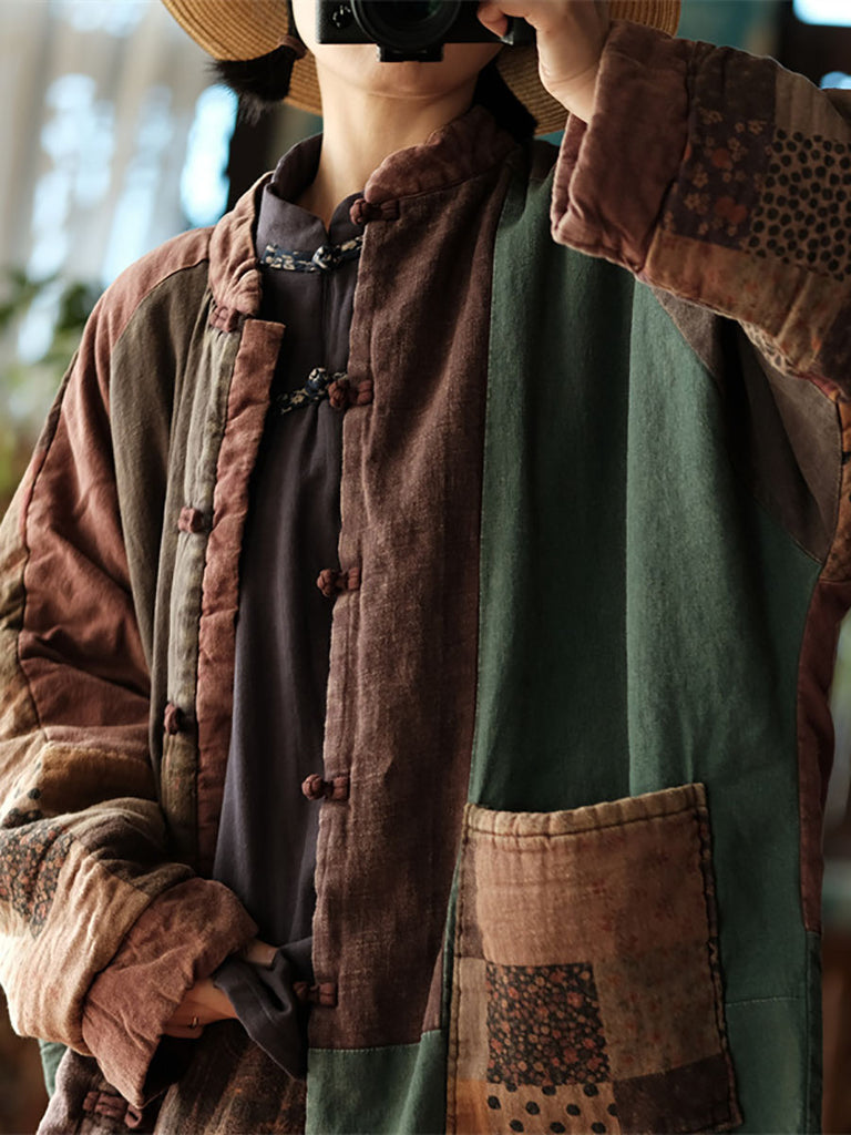 Women Vintage Autumn Patch Spliced Long Cotton Robe Coat