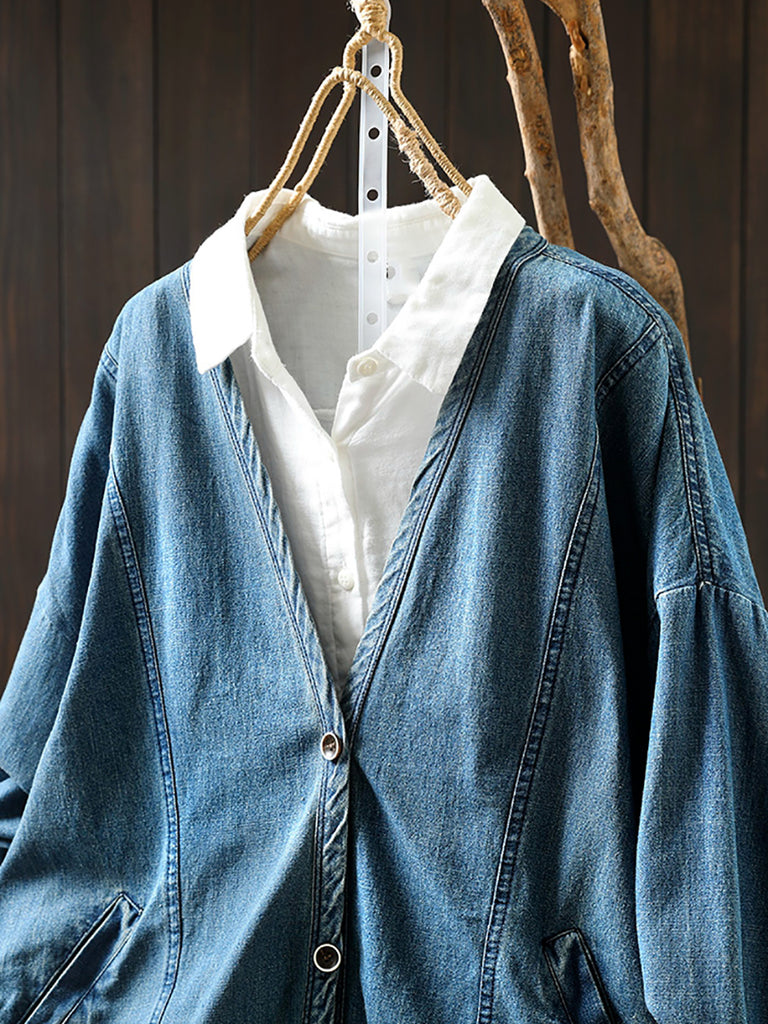 Women Vintage Spring V-Neck Denim Shirt Coat