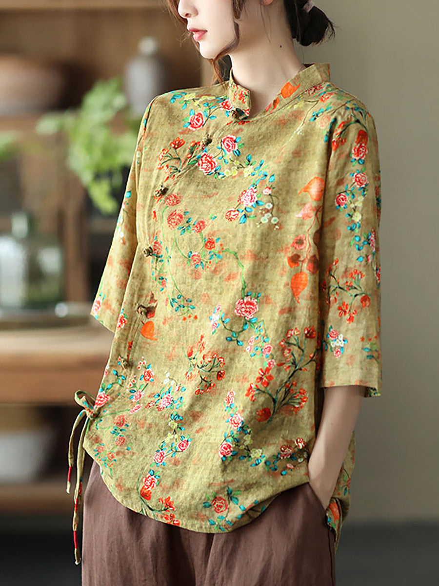 Plus size - Cotton Linen Floral Irregular Vintage Shirt