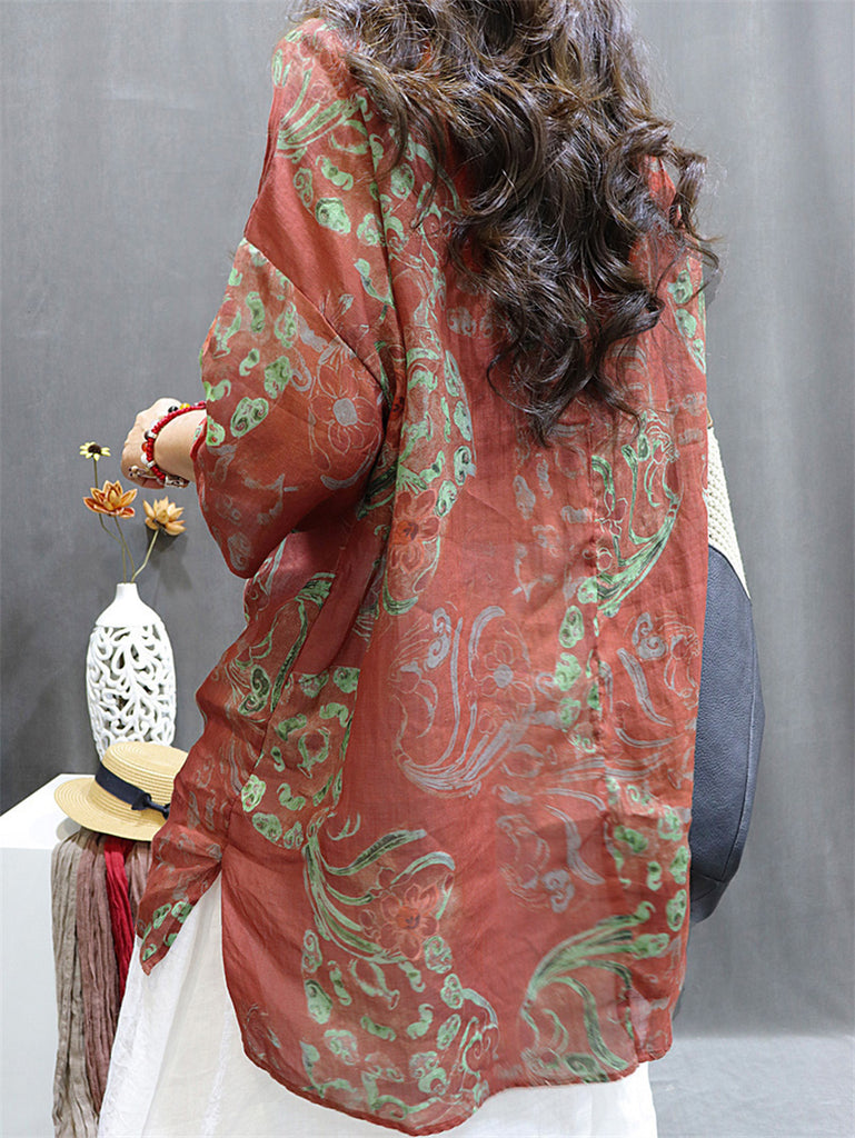Plus Size Women Summer Vintage Flower Ramie Blouse M-4XL