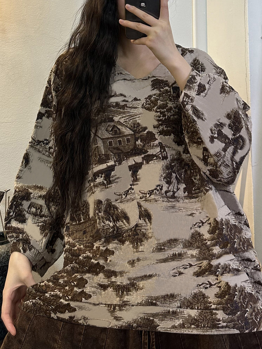Plus Size Women Vintage Print V-Neck Long Sleeve Shirt