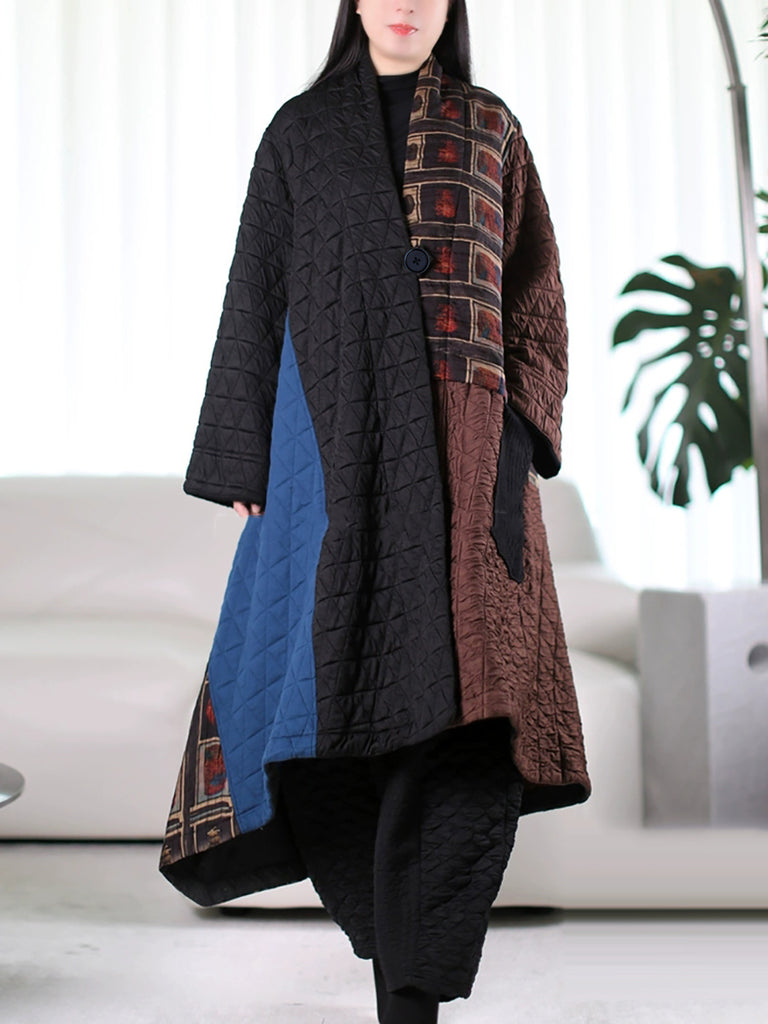 Plus Size Women Autumn Ethnic Colorblock Padded Coat