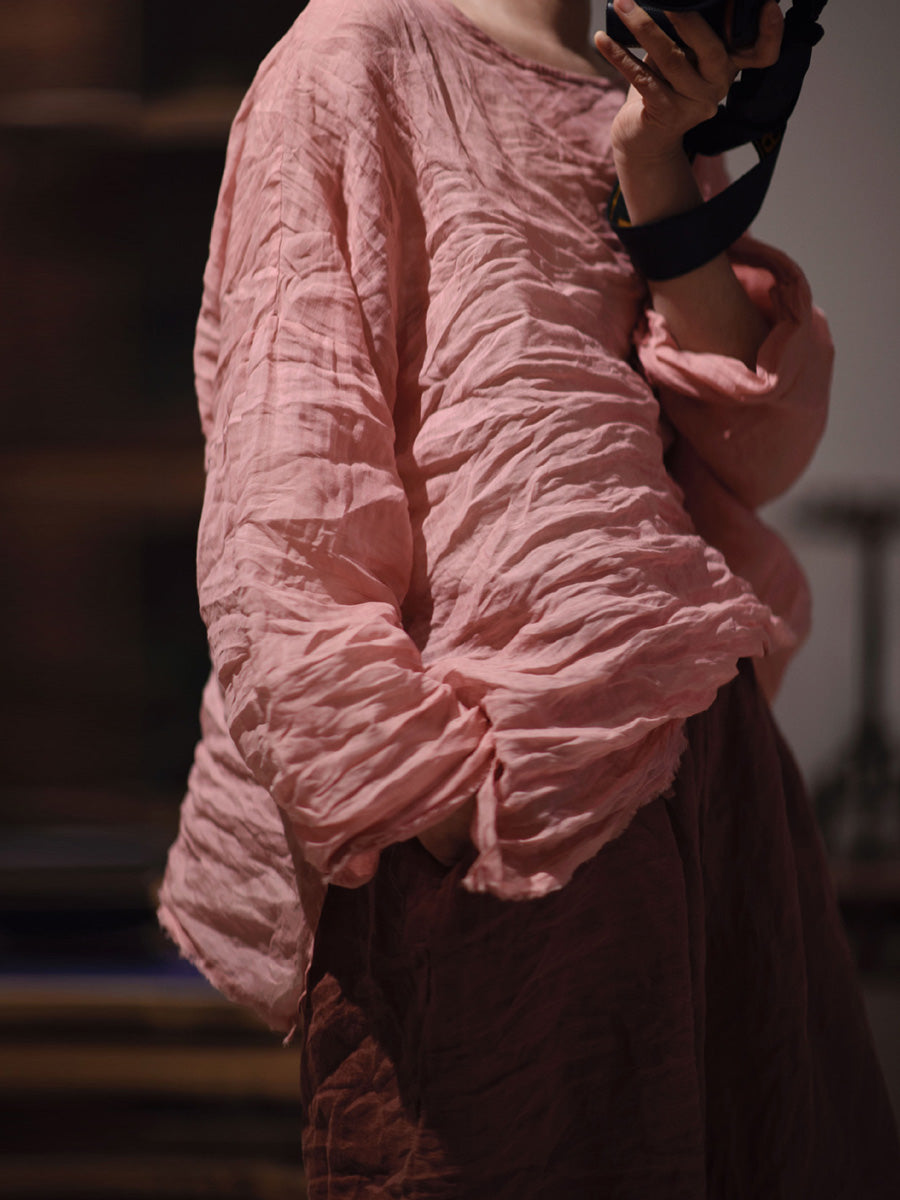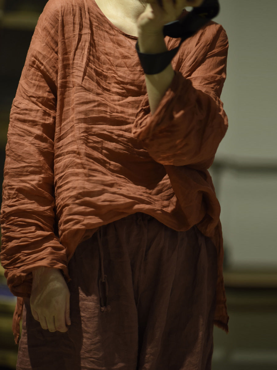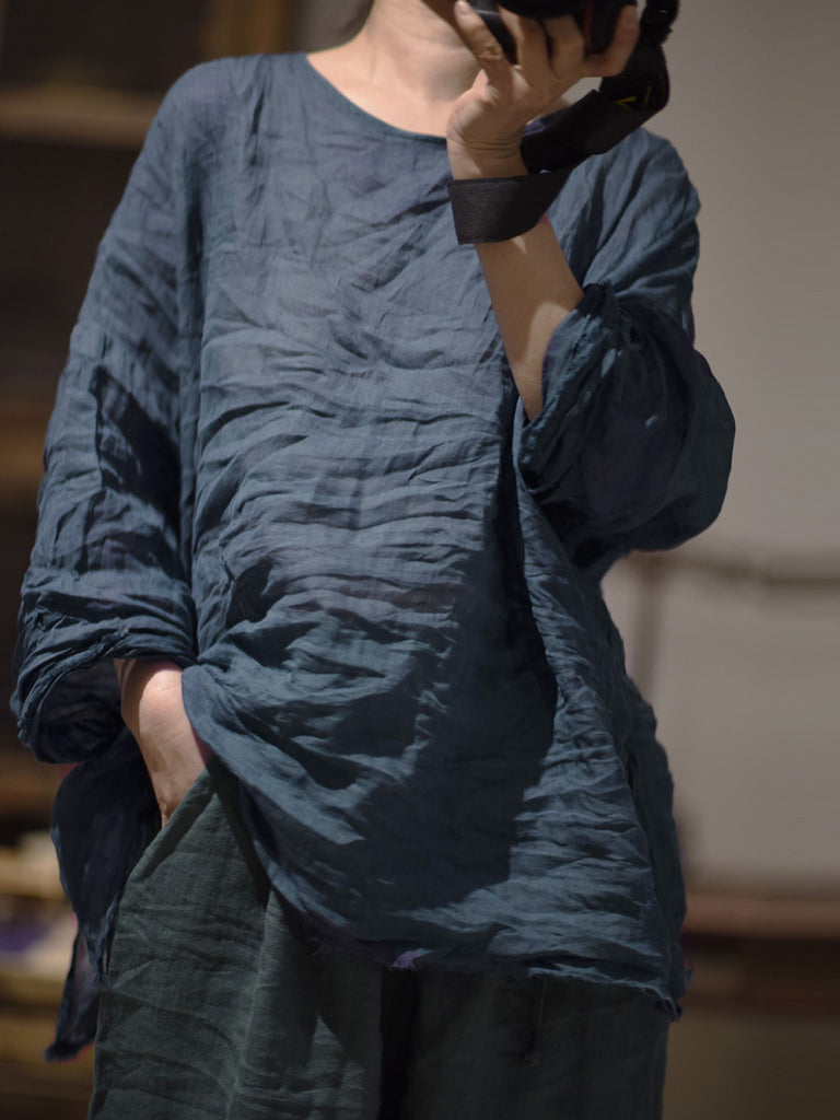 Women Autumn Solid Vintage O-Neck Ramie Blouse