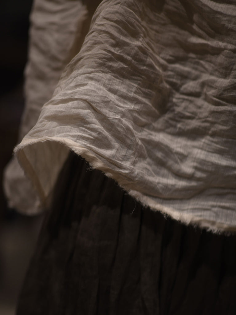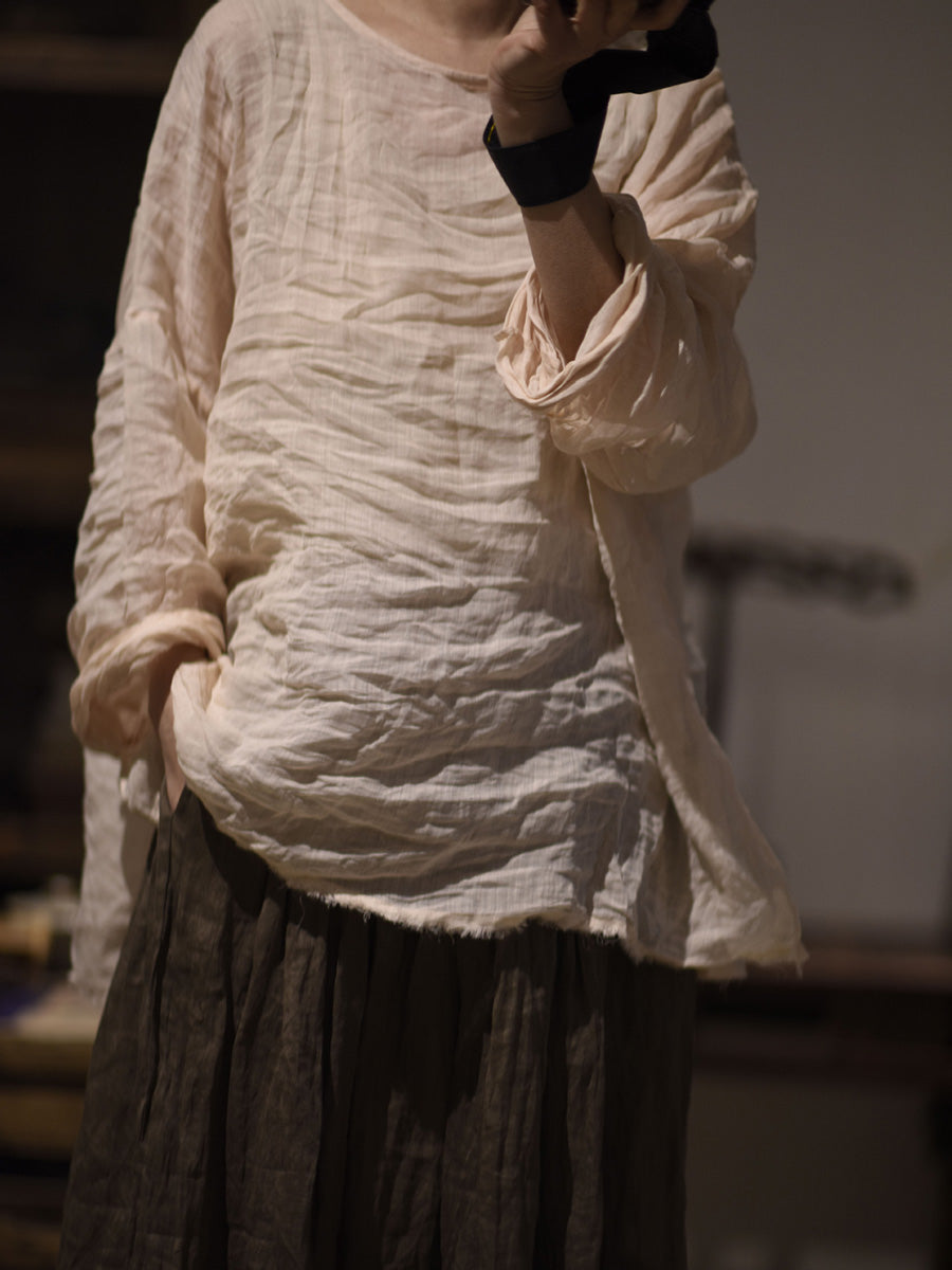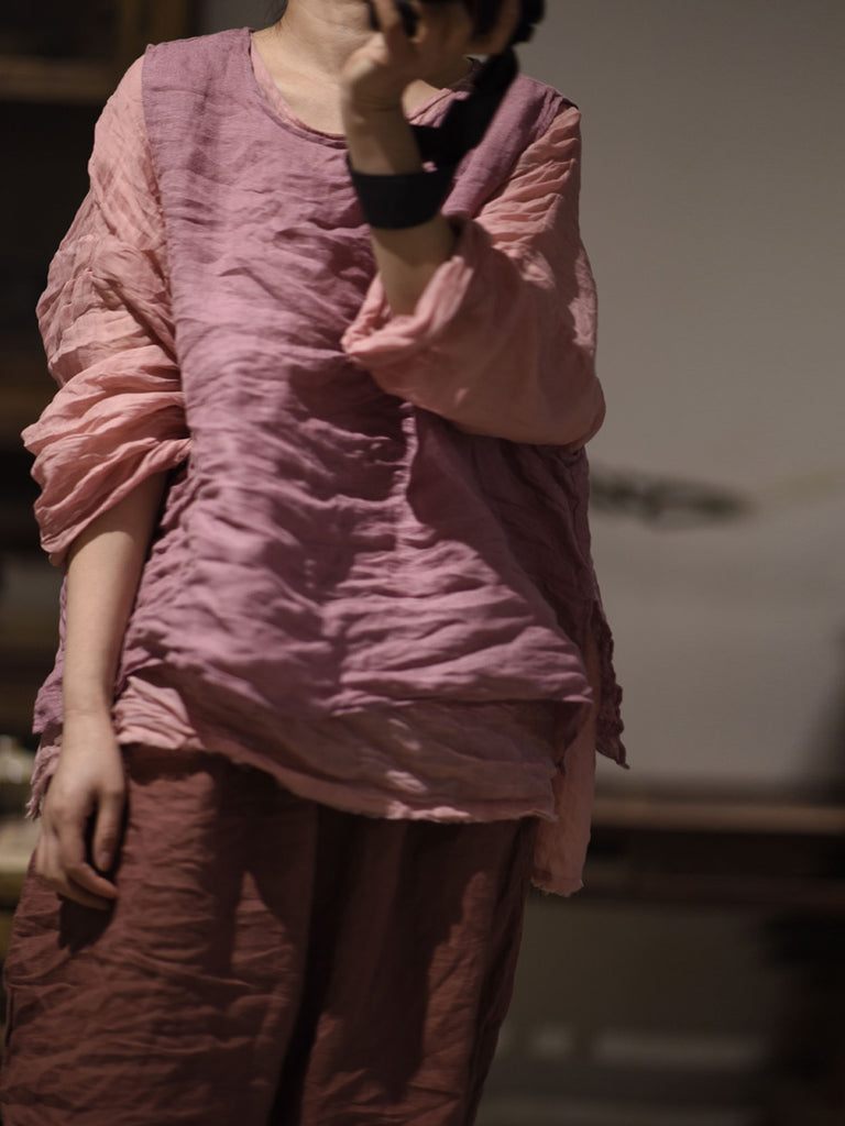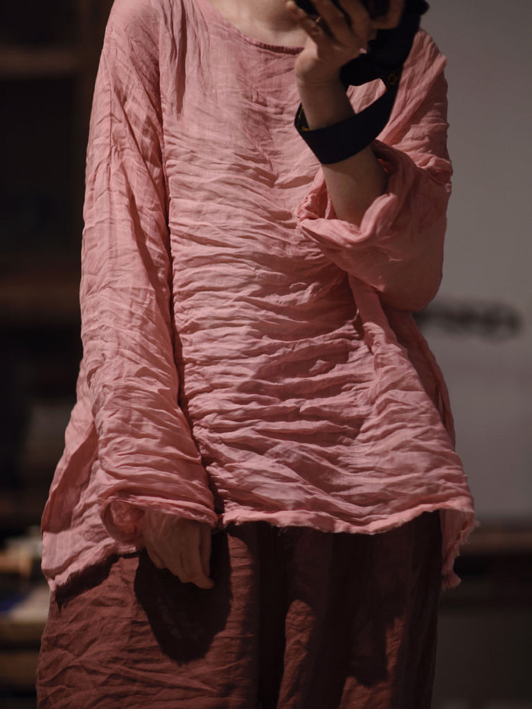 Women Autumn Solid Vintage O-Neck Ramie Blouse