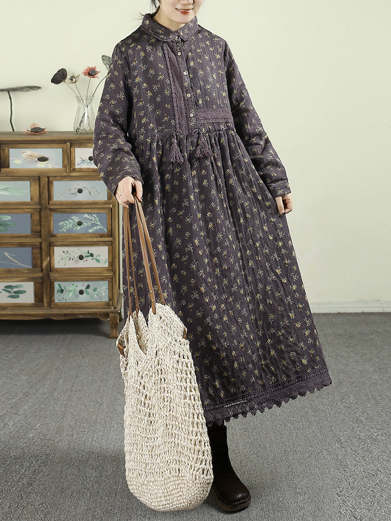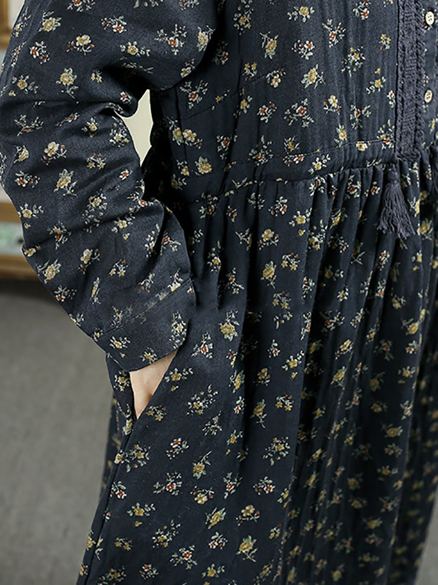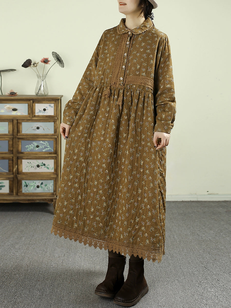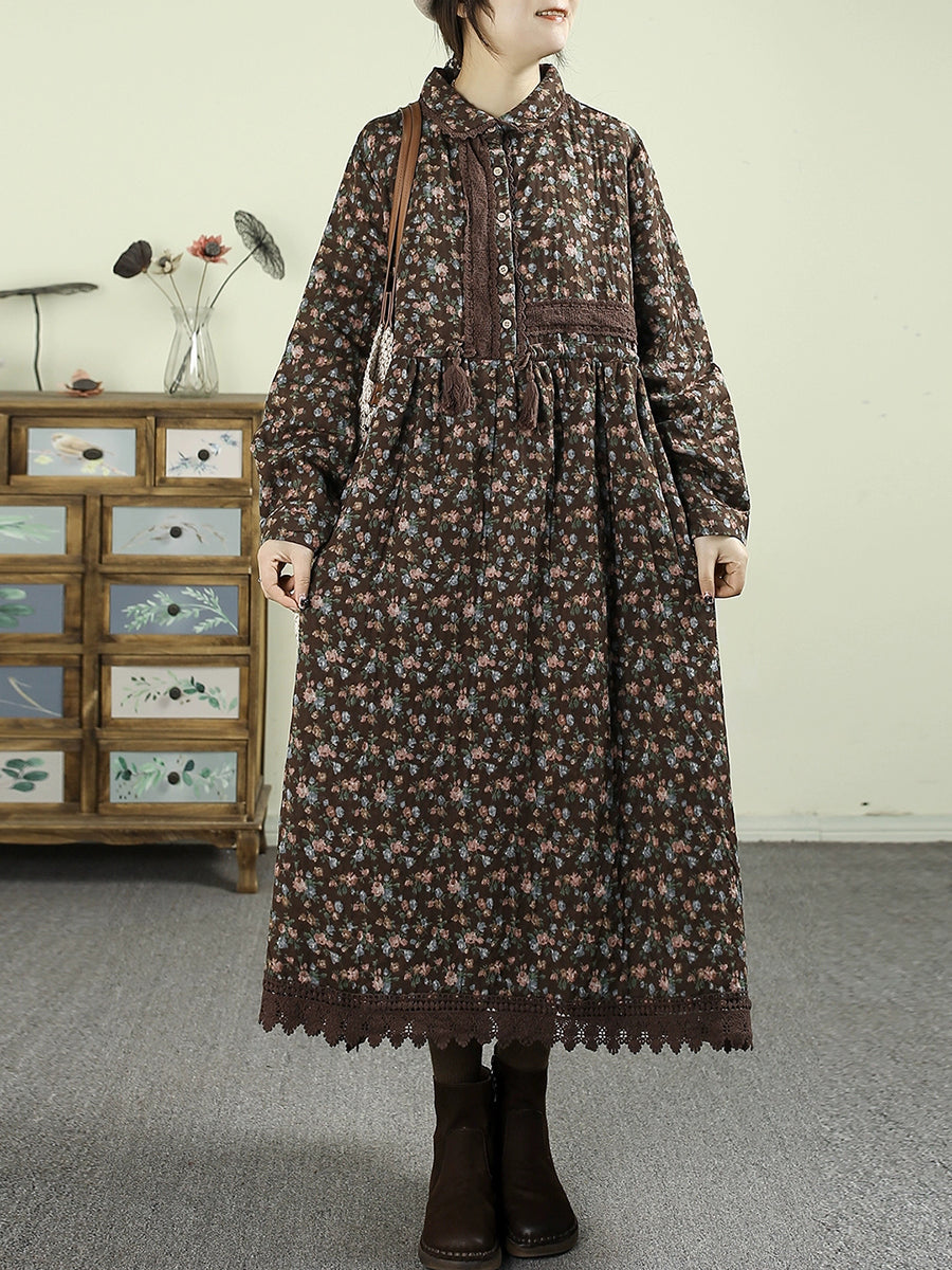 Women Autumn Vintage Floral Turn-down Collar 100%Cotton Dress