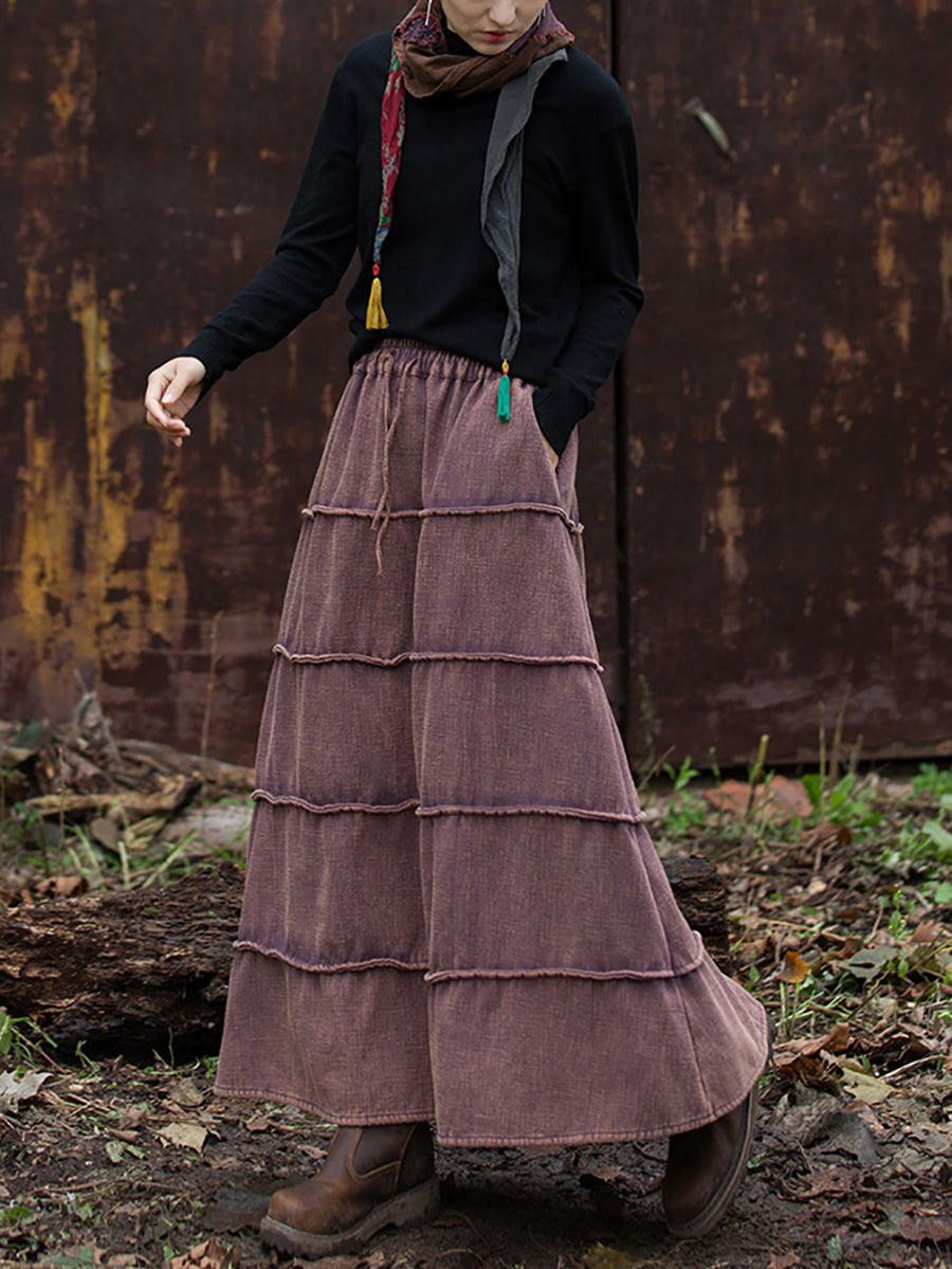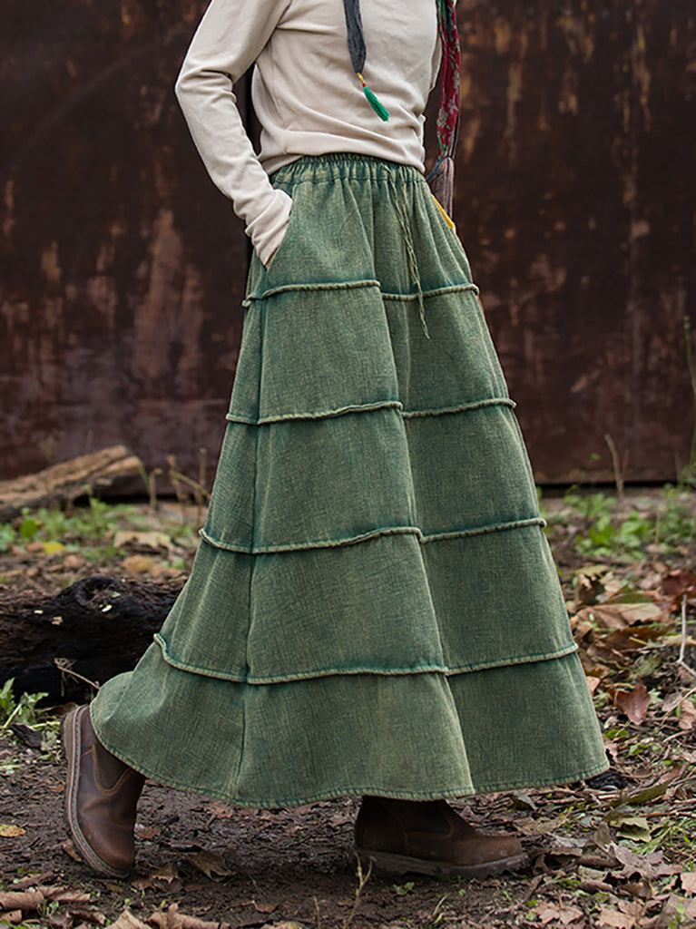Women Retro Spliced Ramie Fleece-lined Skirt