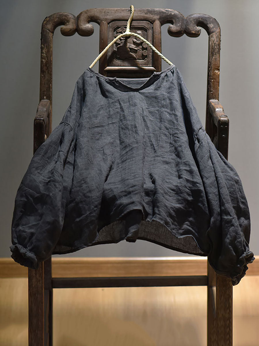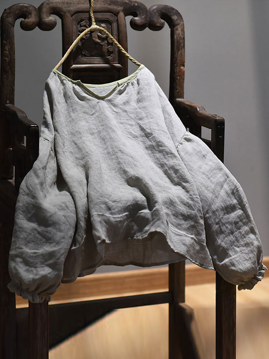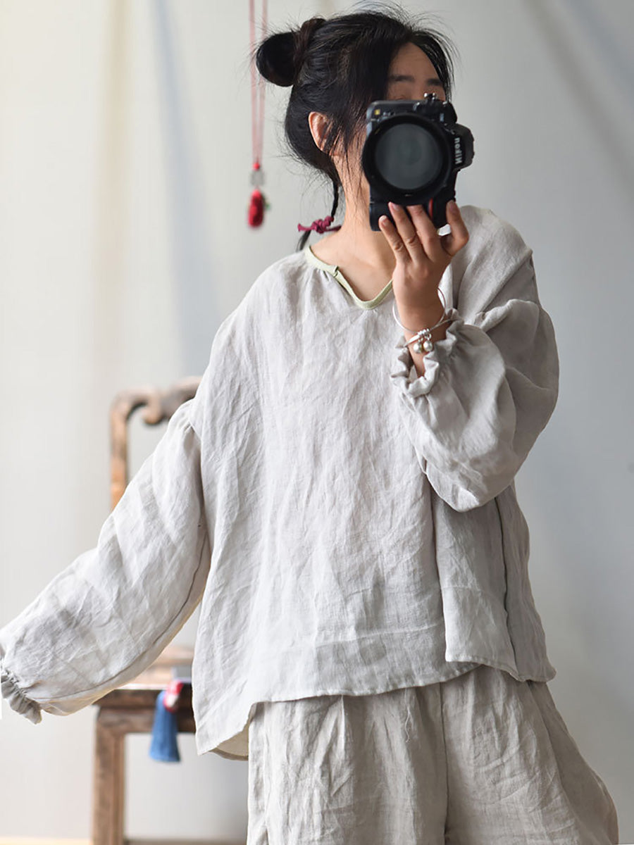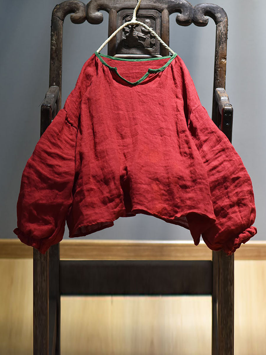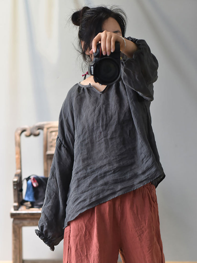 This linen shirt features a solid pattern, V-neck collar, puff sleeves, raglan sleeves, and a vintage style. It is perfect for the spring season and exudes a classic, retro vibe.