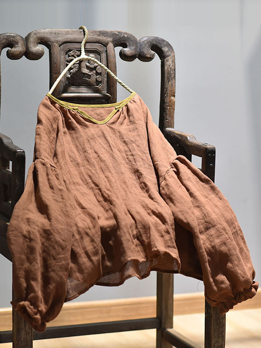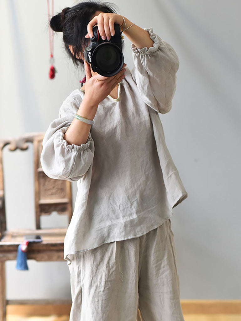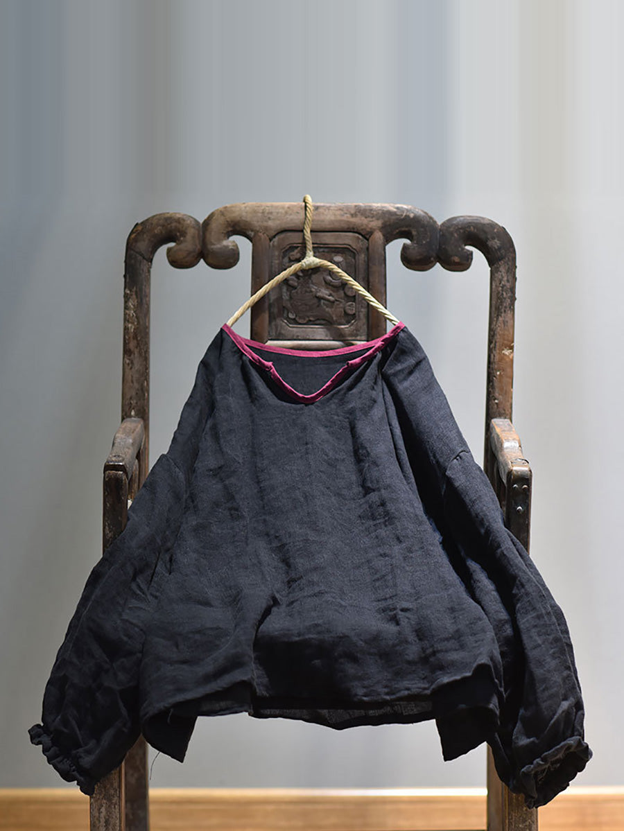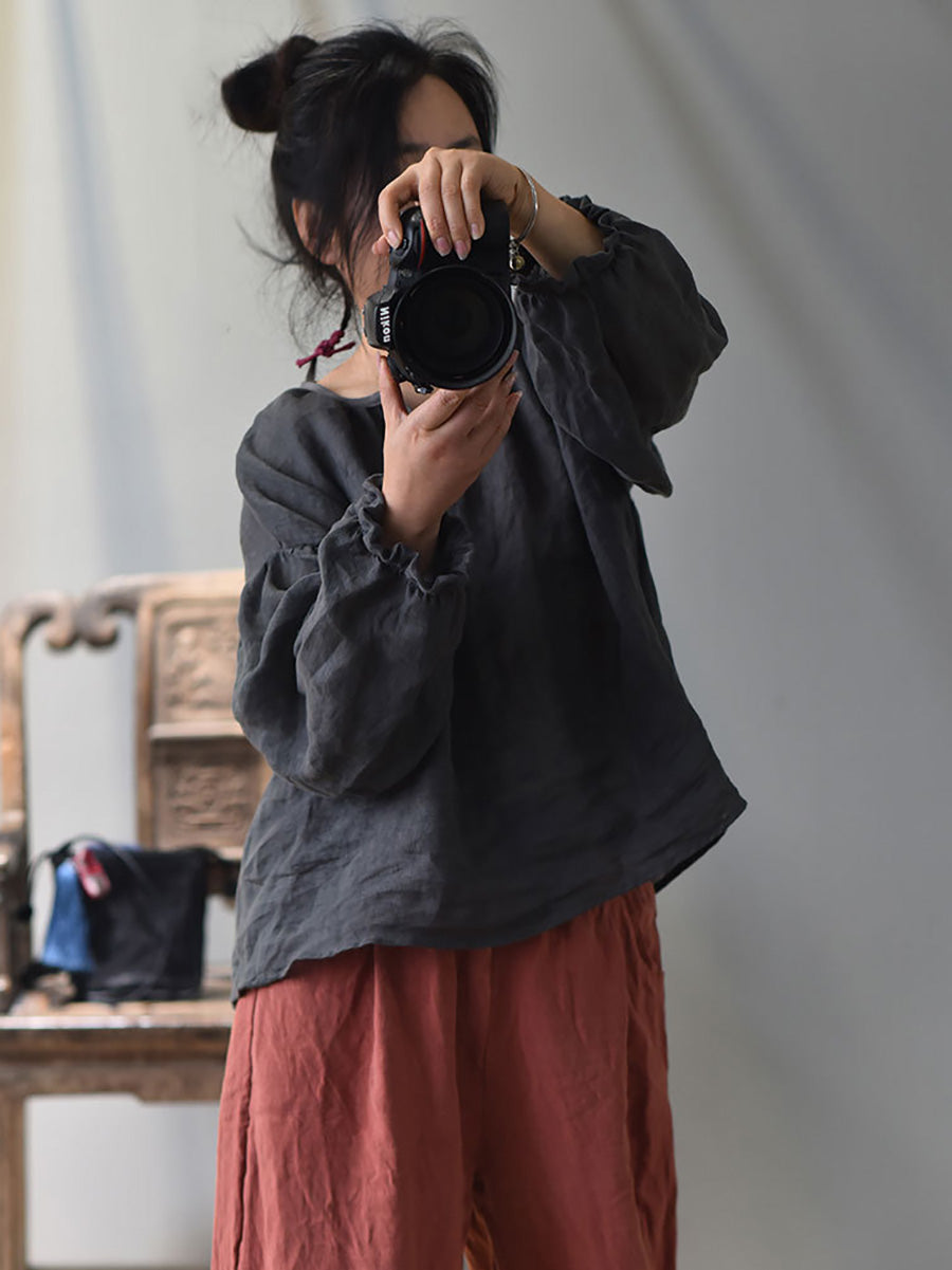 This linen shirt features a solid pattern, V-neck collar, puff sleeves, raglan sleeves, and a vintage style. It is perfect for the spring season and exudes a classic, retro vibe.