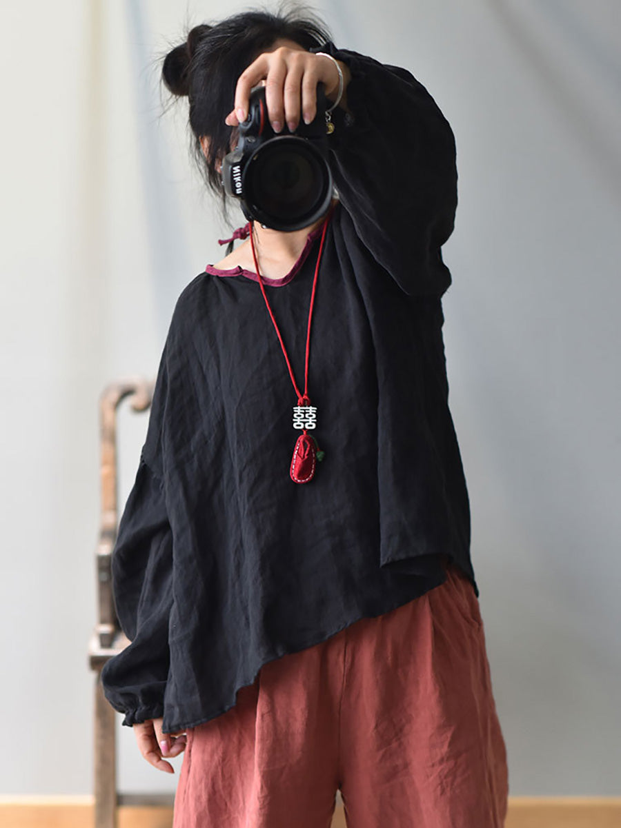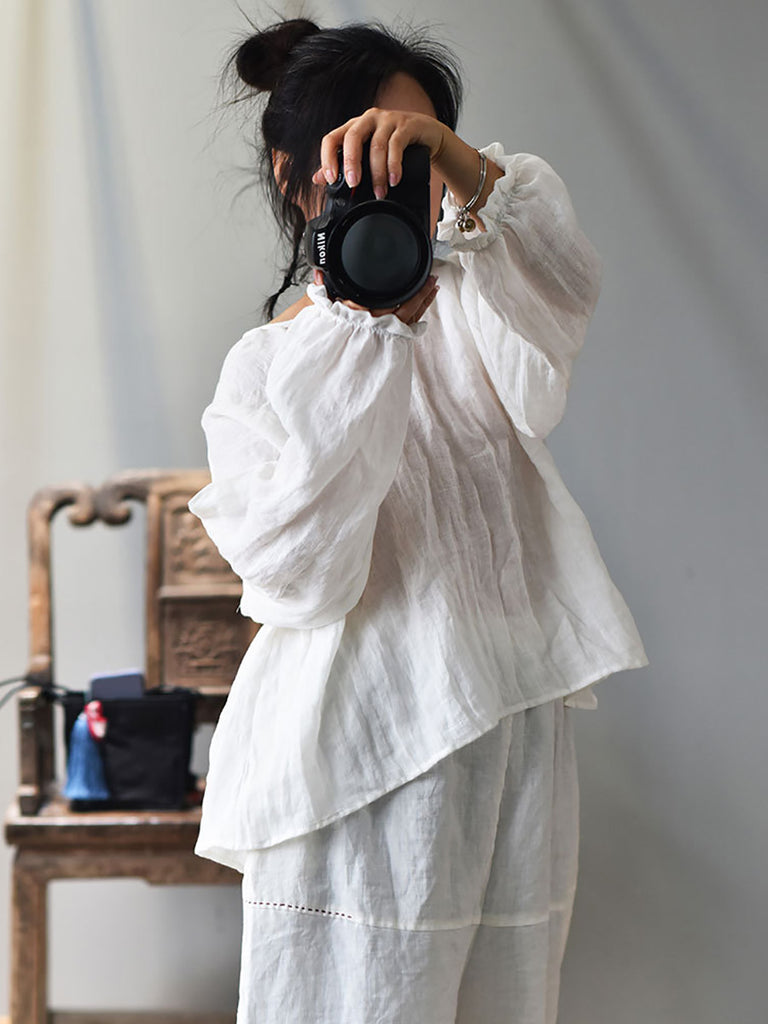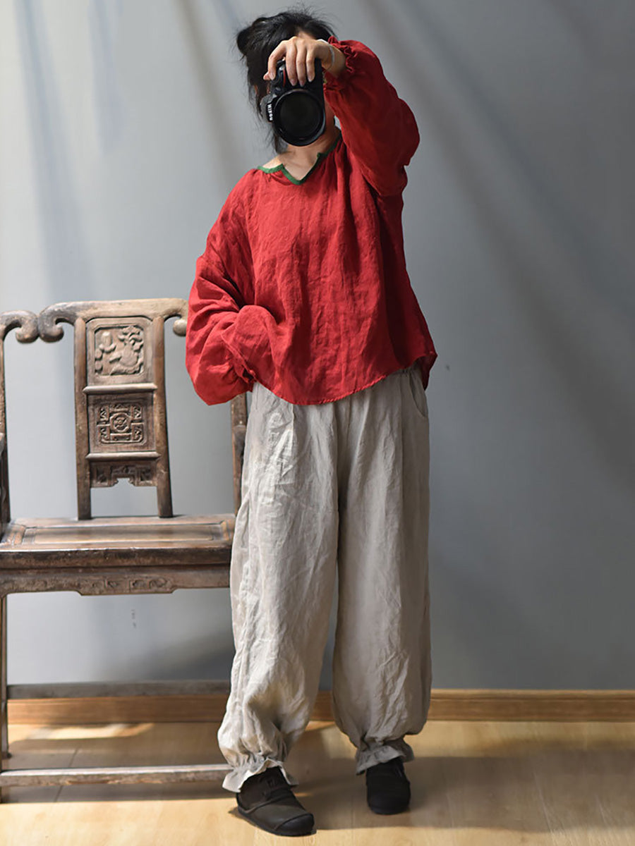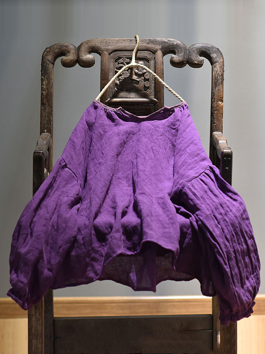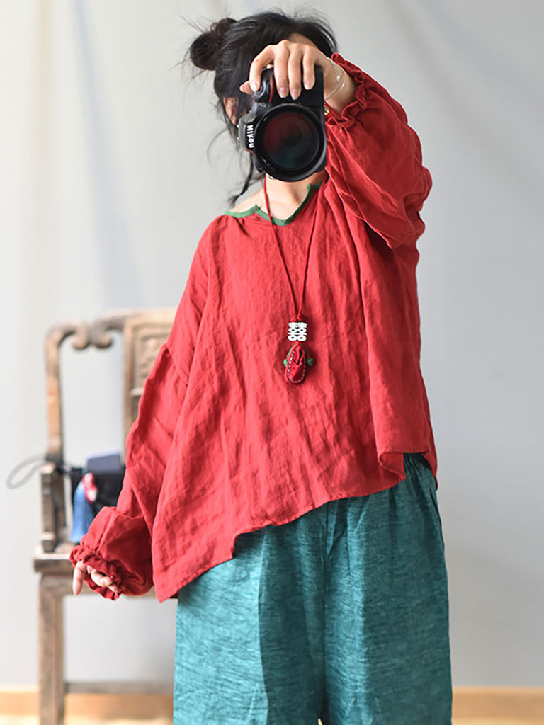 This linen shirt features a solid pattern, V-neck collar, puff sleeves, raglan sleeves, and a vintage style. It is perfect for the spring season and exudes a classic, retro vibe.