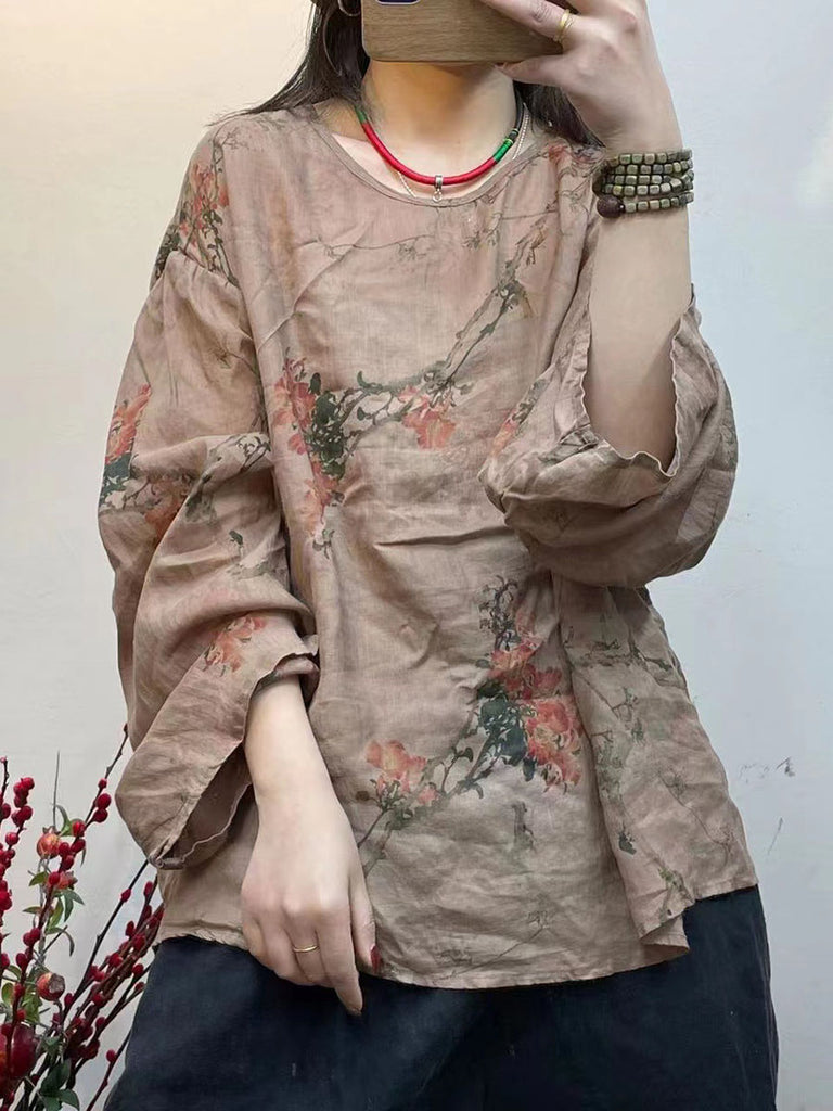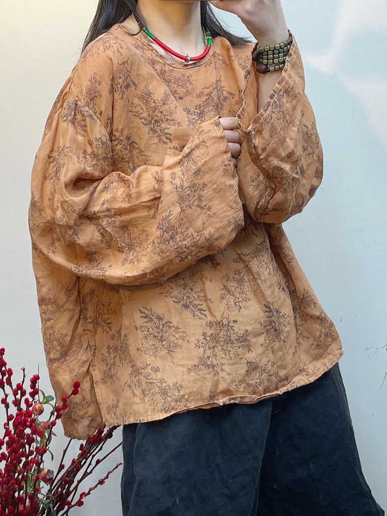 Plus Size Women Spring Vintage Floral Print Loose Thin Shirt