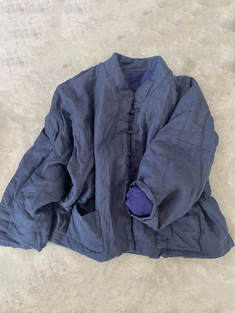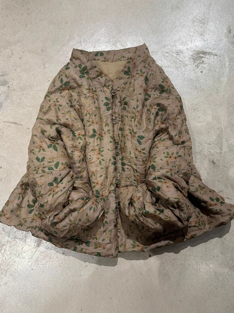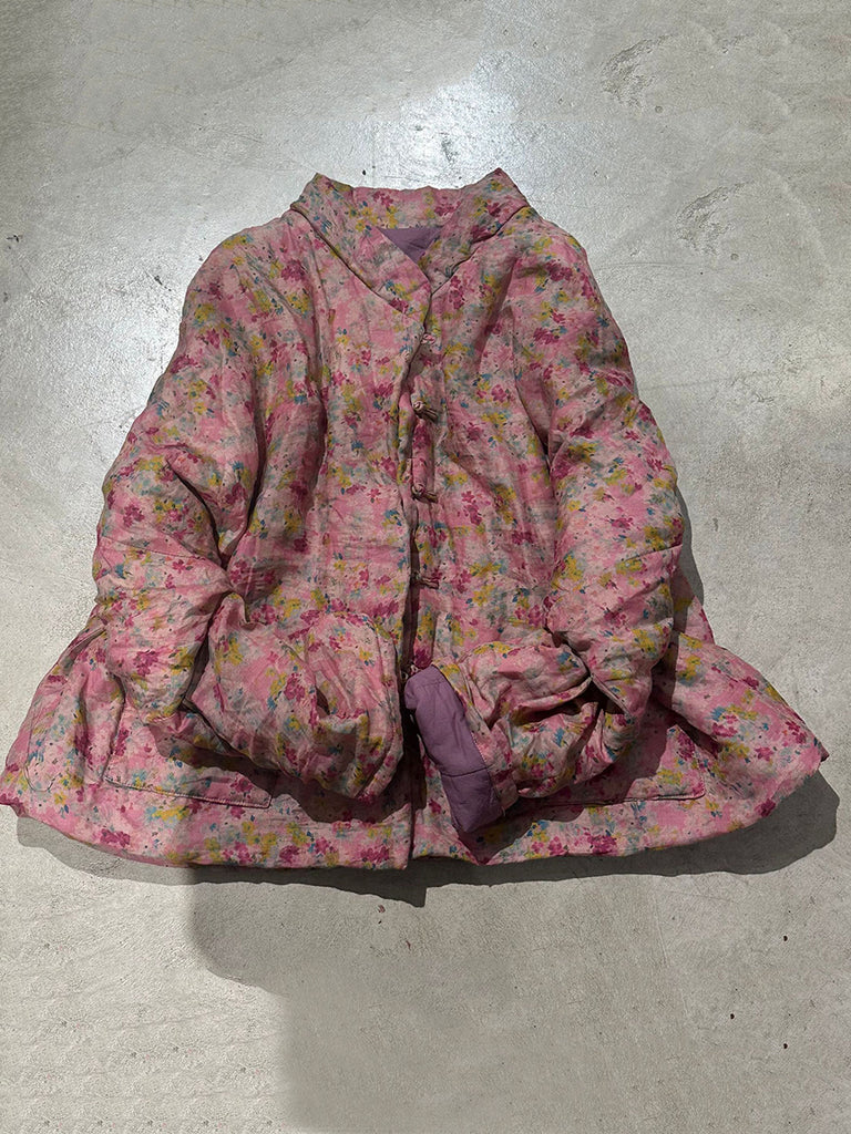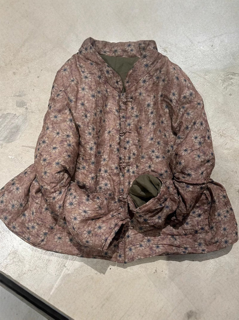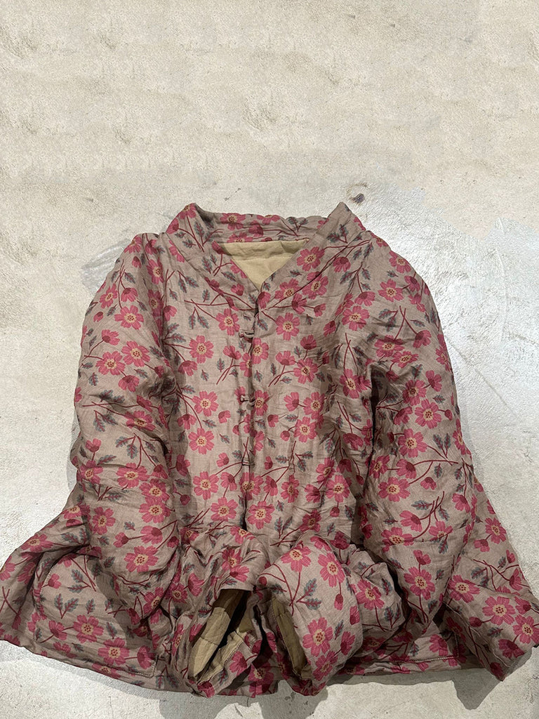 This vintage Ramie coat features a beautiful floral pattern and a stand collar. The full, raglan sleeves add an artsy touch, making it the perfect addition to your autumn and winter wardrobe.