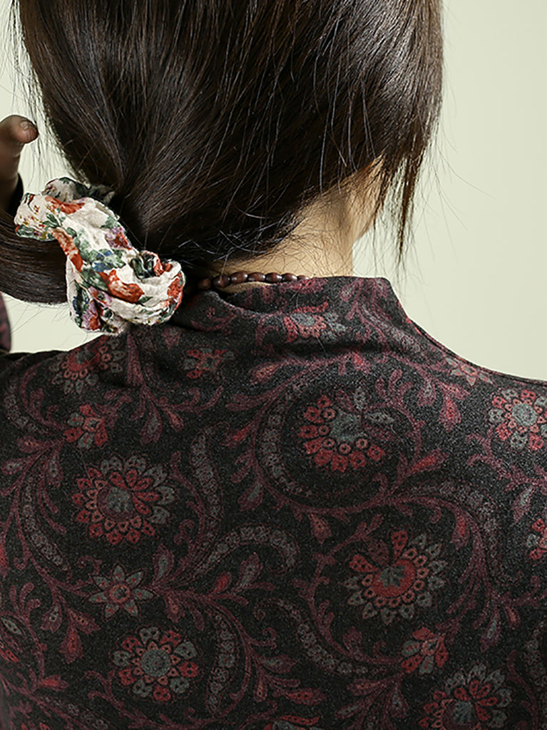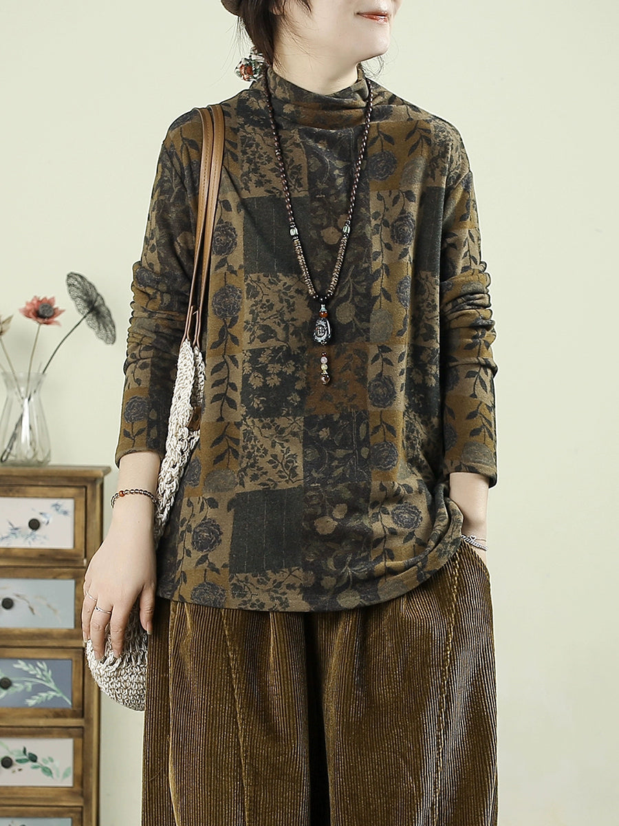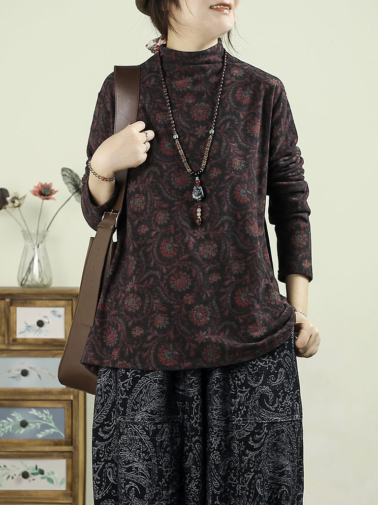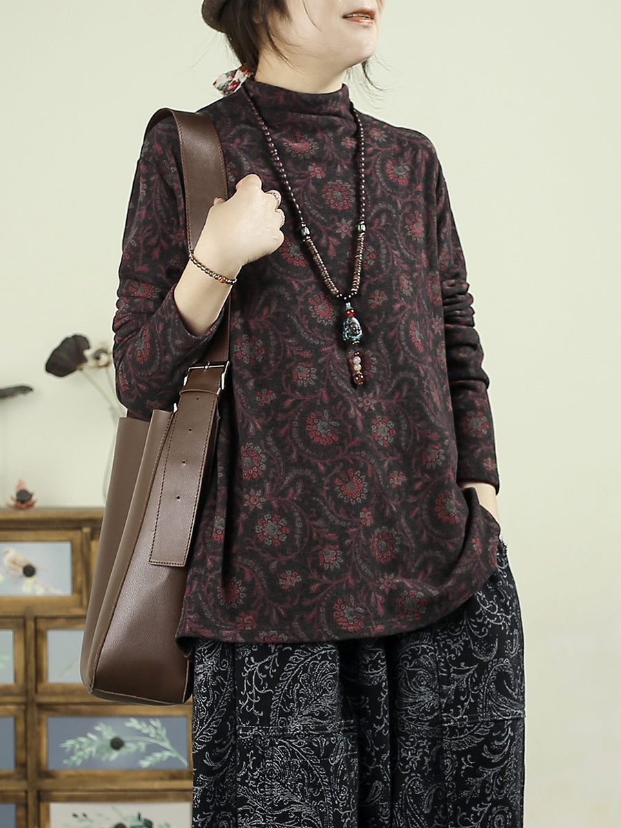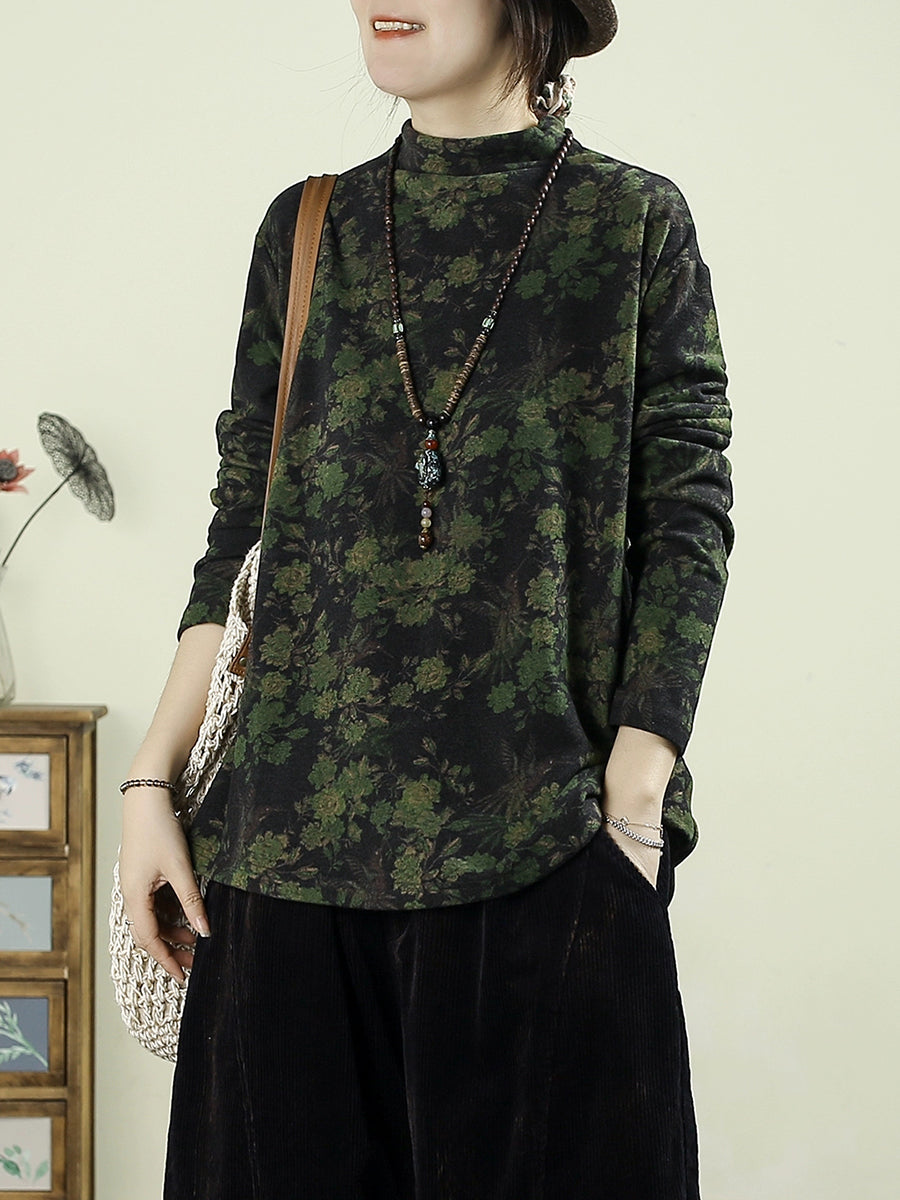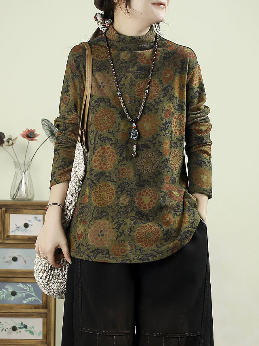 Women Vintage Autumn Flower Half-Turtleneck Blouse
