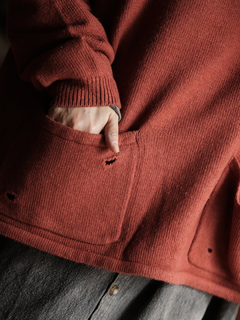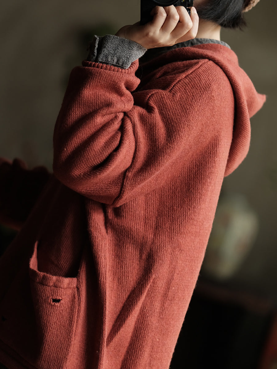 Women Vintage Autumn Frayed Solid Hooded Knit Sweater