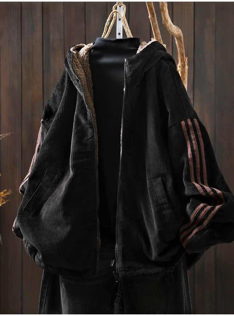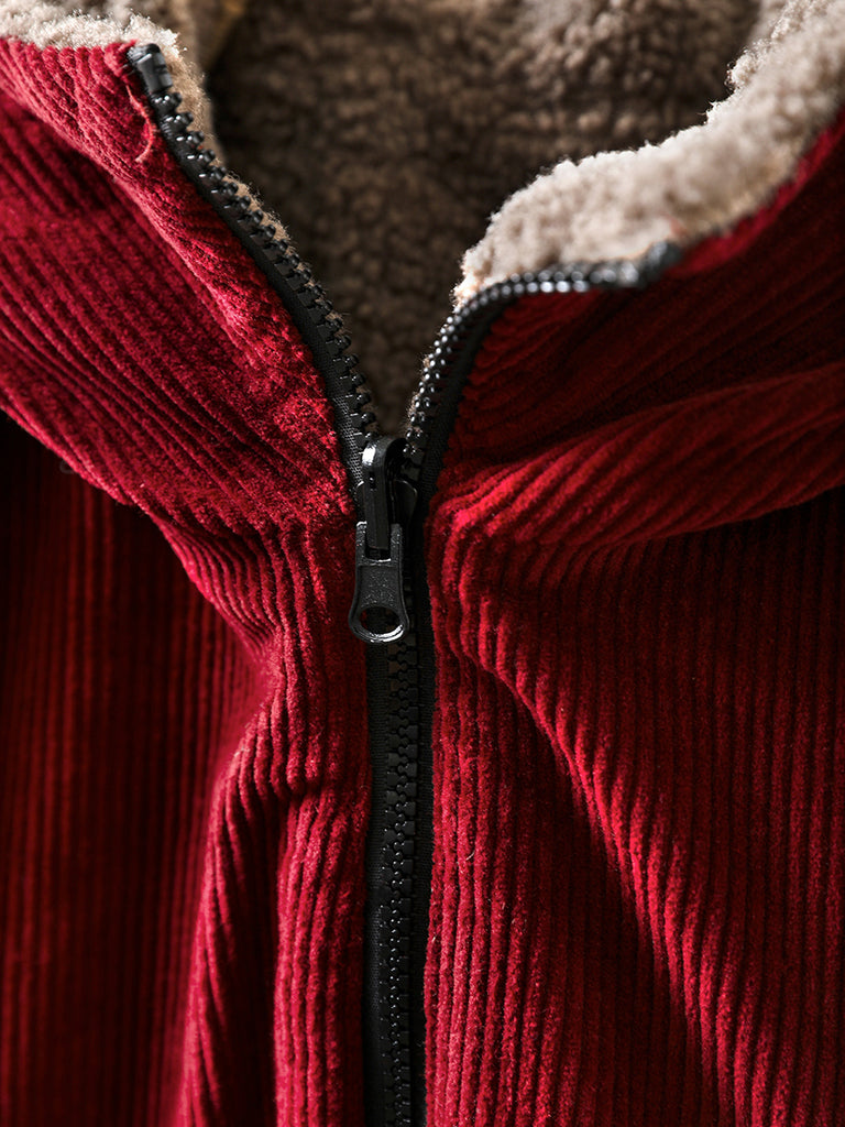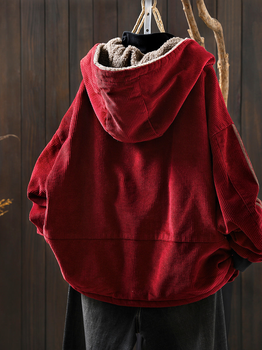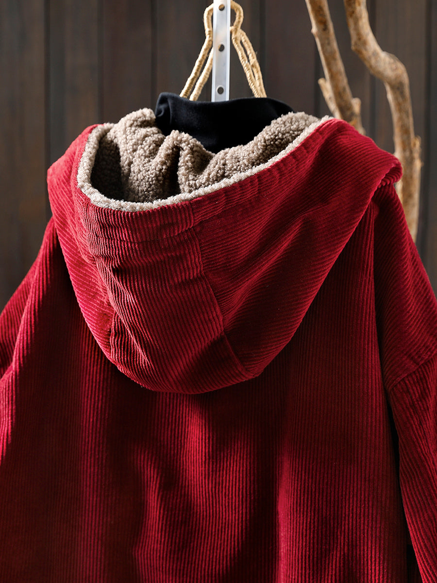 Women Winter Retro Pure Color Fleece-lined Corduroy Hooded Coat